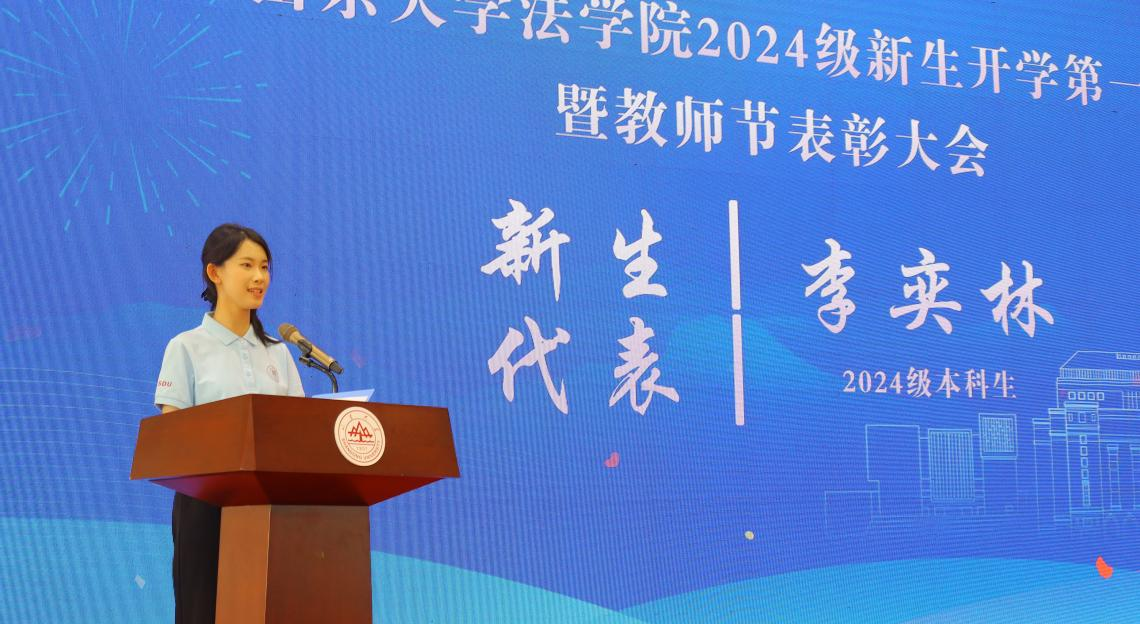 新生代表2024级本科生李奕林在发言中表示,要在新的起点上注重专业知识学习,扎实打牢法学基础。在提高自身法律素养的同时,成长为有情怀、有本领、有理想、有担当的山大法律人;要传承山大法学人优秀品格,爱校荣校,与祖国同心,与时代同频,在金沙集团1862cc成色书写绚丽的人生华章。