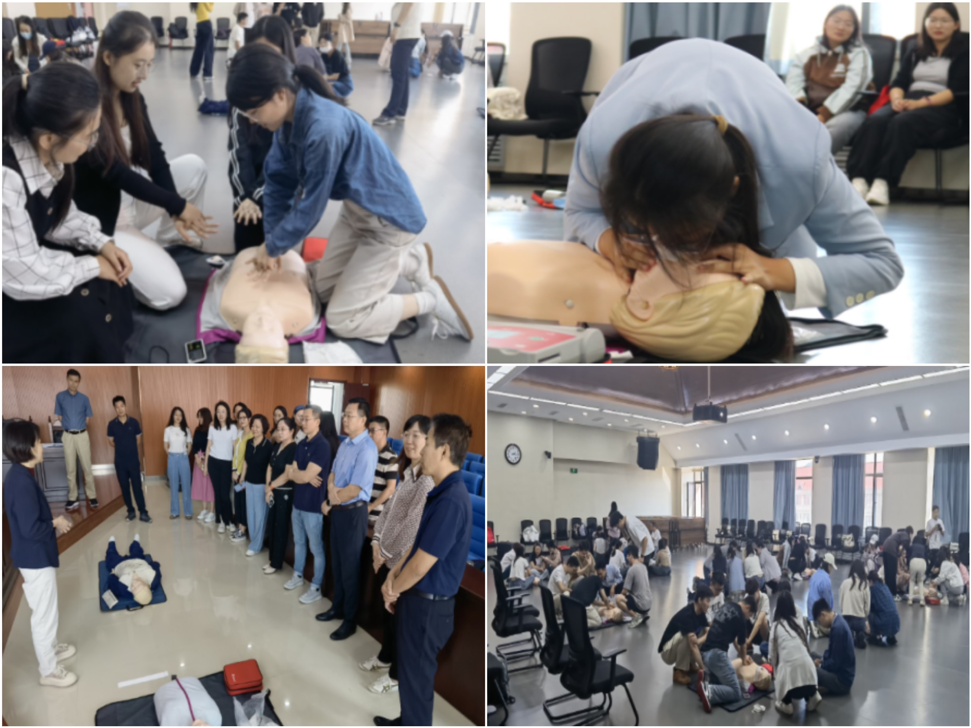 在实践操作环节,为了让参训师生更加有效地体验和掌握急救技能,共进行了三个场次培训。在医学模拟中心副主任杨金玲的主持下,指导老师为师生演示了模拟现场急救过程,包括意识判断、胸外按压、开放气道和人工呼吸等核心步骤,强调按压的位置、力度和频率等关键要素。现场还讲解了如何就近获取AED机器以及AED机器的使用方法。师生参训热情高涨,积极互动,踊跃体验和练习;指导老师耐心指导,细致解答大家提出的各种问题,还模拟了心肺复苏急救考核。