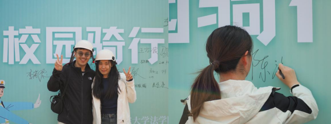 游戏过后,活动参与人员承诺将强化自身安全意识,以身作则,规范佩戴头盔,牢记安全规则,践行文明行驶,并纷纷在“校园骑行,安全同行”展板前郑重签名。