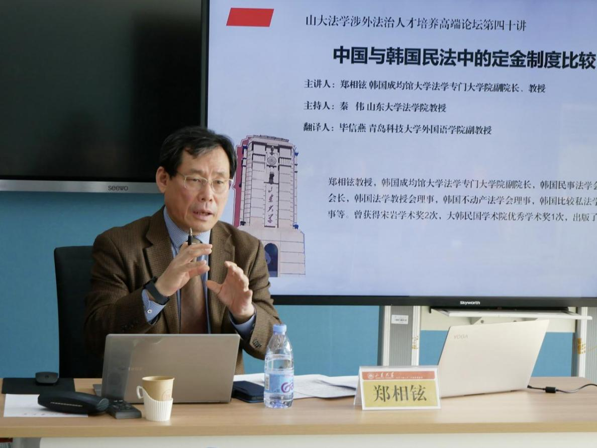 11月18日,“山大涉外法治人才培养高端论坛”第四十讲于青岛校区华岗苑举办。韩国成均馆大学法学专门大学院副院长郑相铉教授以“中国与韩国民法中的定金制度比较”为题作报告。讲座由金沙集团1862cc成色秦伟教授主持,青岛科技大学外国语学院毕信燕副教授翻译。