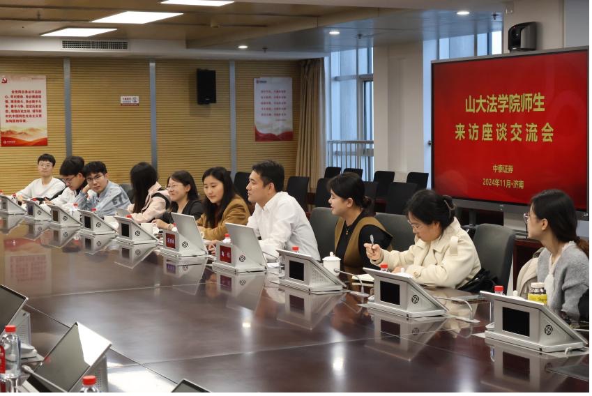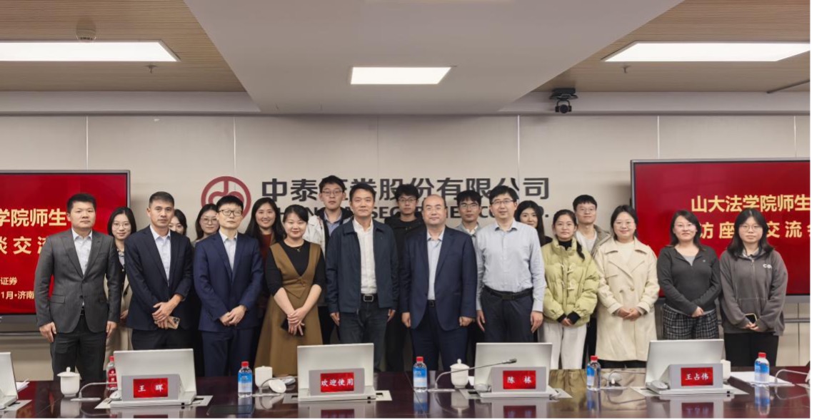 14日下午,师生走进中泰证券股份有限公司。中泰证券股份有限公司法律事务部总经理刘传新、人力资源部副总经理陈栋、规划发展部副总经理王晖、综合办公室副主任王占伟与投资银行业务委员会质控部的王国良出席座谈会。双方就公司概况、法律人才培养、法律素养提升等方面问题展开研讨。