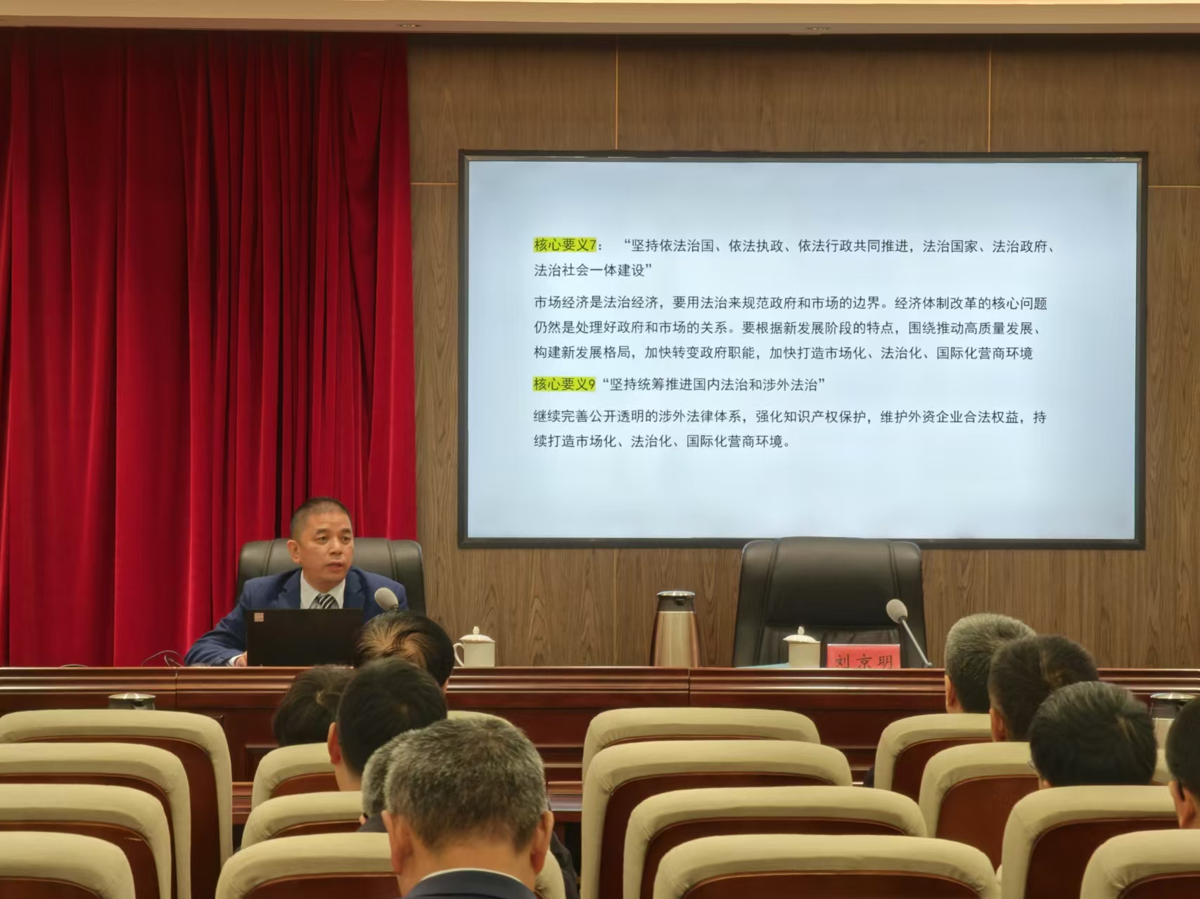 11月21日,胶州市委理论学习中心组(扩大)法治专题报告会在市级机关办公大楼一楼东会议室召开,会议由市委常委、政法委书记刘京明同志主持。金沙集团1862cc成色院迟德强副教授应邀作了《坚持统筹推进国内法治和涉外法治 构建市场化法治化国际化营商环境》的专题讲座。