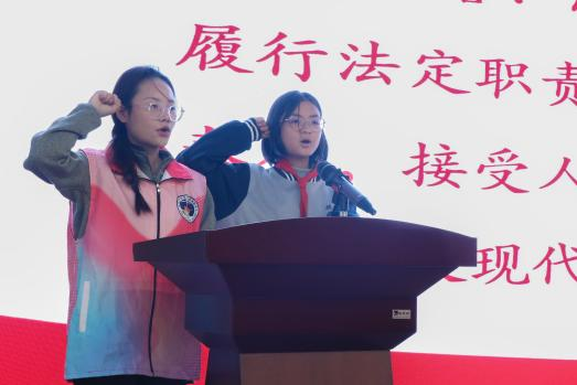 活动在庄严的国歌声中拉开序幕,山东大学学生法律援助中心志愿者与超银学校学生代表带领全体参与师生共同进行宪法宣誓。