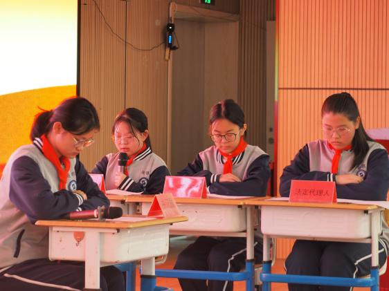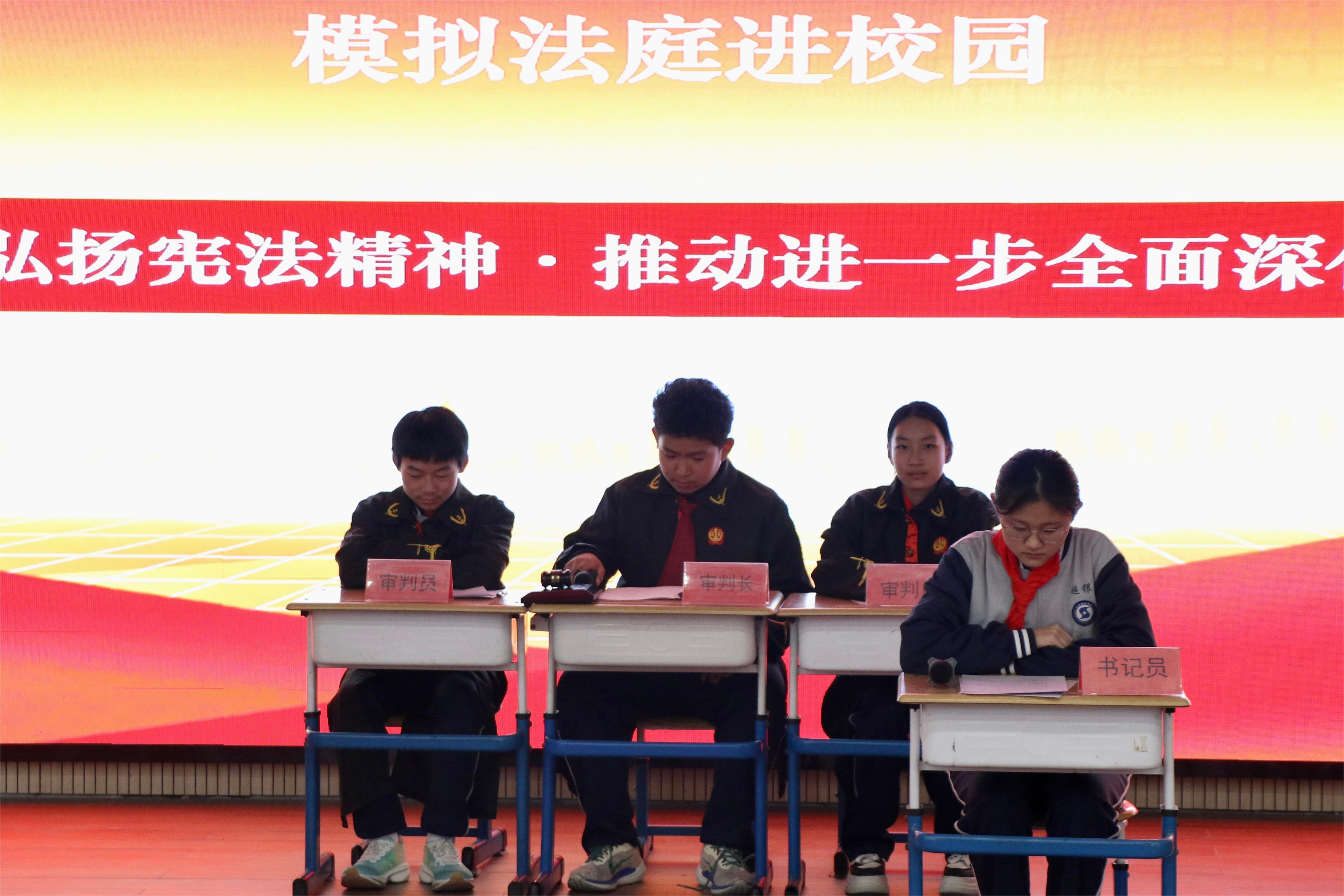随后,来自超银学校的十一名同学分别扮演审判长、书记员、原被告、诉讼代理人等角色,以模拟法庭情景剧的形式向参与师生展示了校园霸凌事件的庭审现场,还原了双方当事人在法庭上举证、质证、辩论的全过程,生动演绎了案件诉讼的法律程序。活动通过“沉浸式”体验让学生认识到校园霸凌的严重性及危害性,切实感受宪法法律与生活息息相关,加深学生对于宪法和法律知识的理解,增强尊法学法守法用法的法治意识。