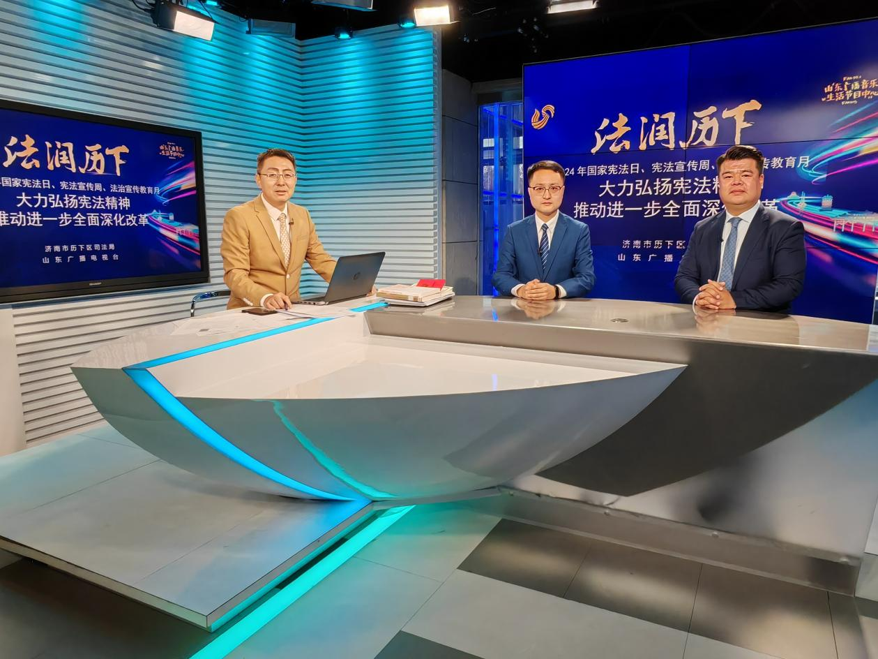 12月7日下午,历下区司法局联合山东广播电视台制作的《法润历下》普法直播节目第116期顺利播出。本期节目的主题是“大力弘扬宪法精神,推动进一步全面深化改革”,金沙集团1862cc成色助理研究员陈伟博士担任主讲嘉宾,山东圣义(济南自贸区)律师事务所执行主任刘诚发担任与谈嘉宾,山东广播电视台广播音乐生活节目中心新媒体科科长谭超杰担任本期节目的主持人。