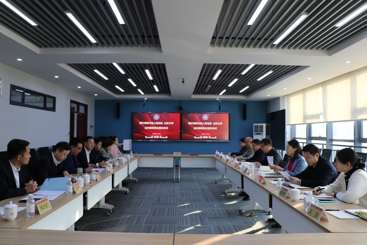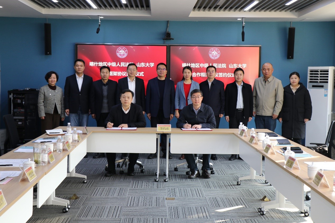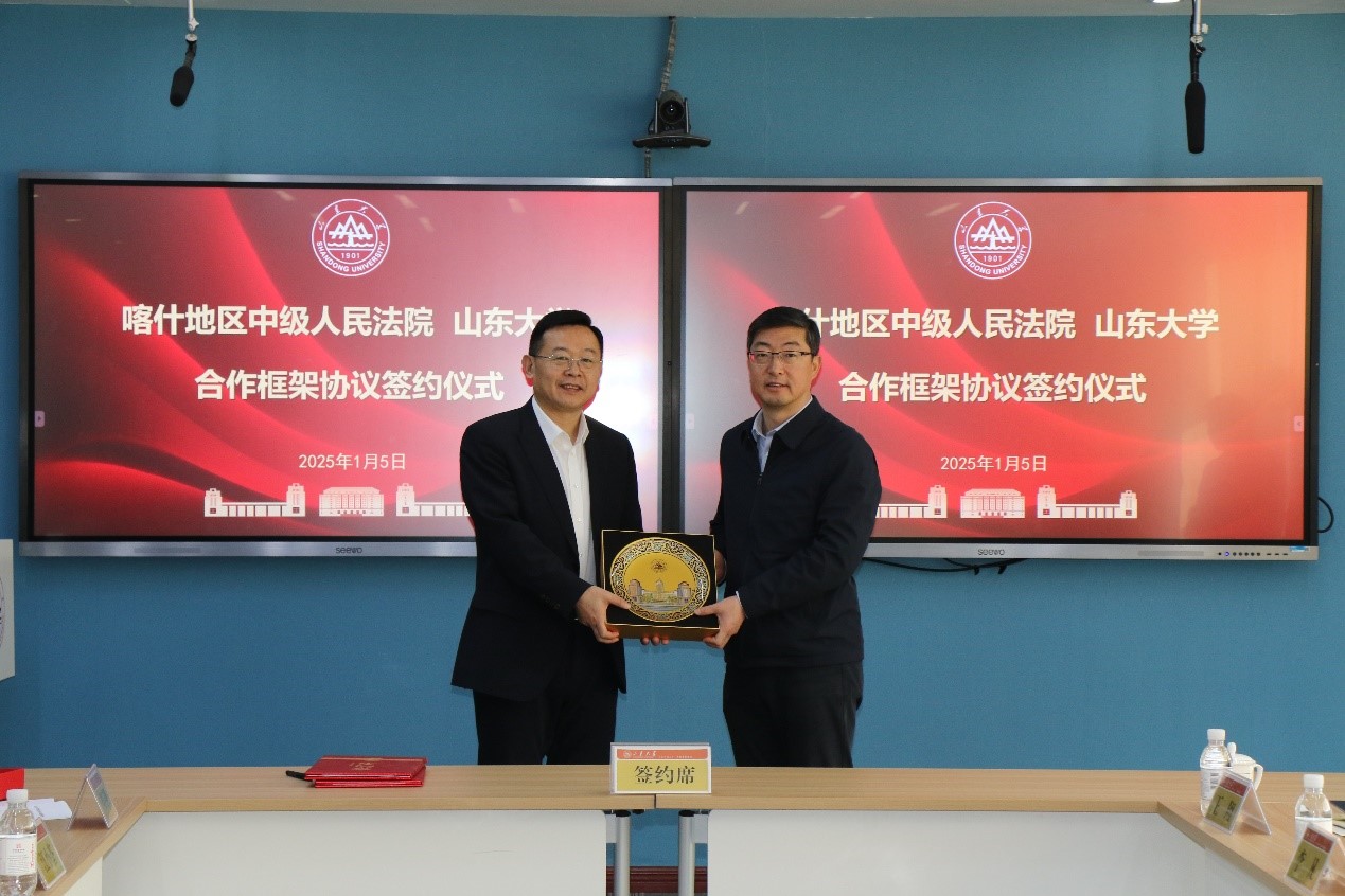 金沙集团1862cc成色院长、金沙集团1862cc成色(威海)院长周长军与喀什地区中级人民法院党组书记、副院长余亮代表双方签订合作框架协议书。签约结束后,双方就人才交流、学生就业、教育培训等方面进行了座谈交流,于向明代表金沙集团1862cc成色向喀什地区中级人民法院赠送山东大学校景盘。
