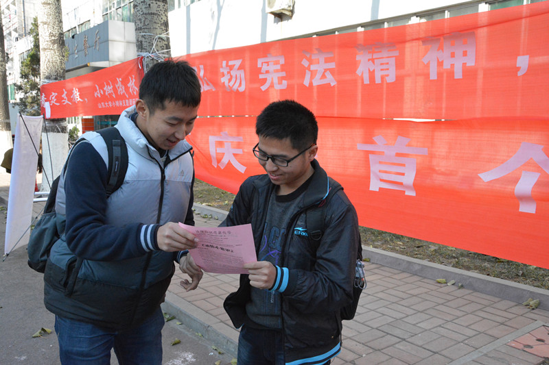 12月4日“国家宪法日”当天,金沙集团1862cc成色各学生组织在泉城广场、英雄山、洪家楼广场和各个校区举行盛大的宪法宣传和法律援助活动。活动以“弘扬宪法精神,建设法治中国”为主题,旨在宣传宪法精神、普及宪法知识,促进宪法、法治观念进一步深入民心。活动现场,志愿者们向广大市民和在校大学生发放法律宣传材料,热心讲解法律知识,开展现场法律咨询,用实际行动营造广泛参与、积极学法用法的良好法治氛围。