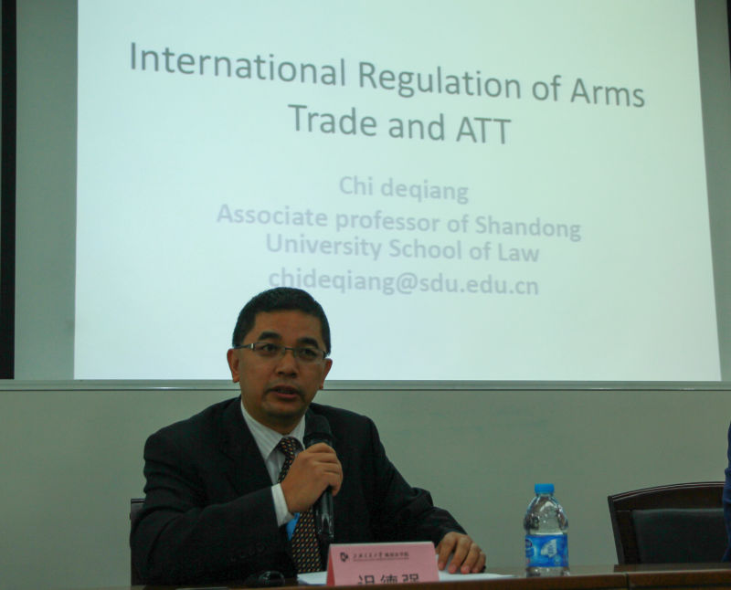 迟德强副教授以英文做了题为“International Regulation of Arms Trade and ATT”的报告。报告介绍了《联合国武器贸易条约》的谈判和制定过程,分析了缔结武器贸易条约的必要性,进而对武器转让的规则进行了深入剖析,最后客观评价了该条约在国际人道法发展中的积极意义。迟德强副教授的报告引起了与会者的热烈讨论。