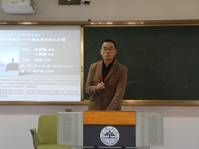 12月6日上午10时,卓越法律人才培养•职业规划和法学学习系列首场讲座在山东大学青岛校区振声苑E204举行。山东文康律师事务所高级合伙人、济南分所主任孙德新律师及其团队、专职律师于佩佩、文康律师事务所人事部袁椰出席了宣讲会。