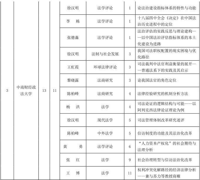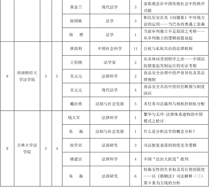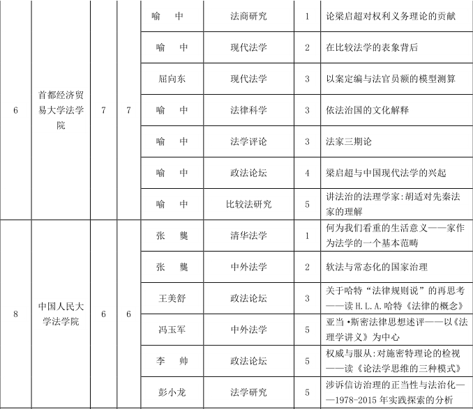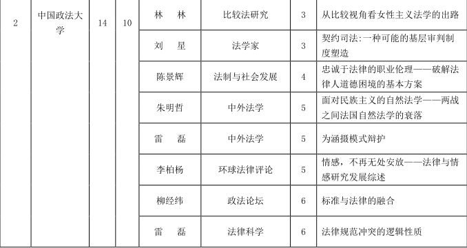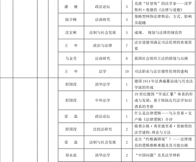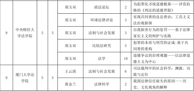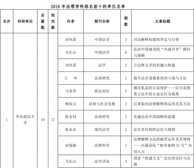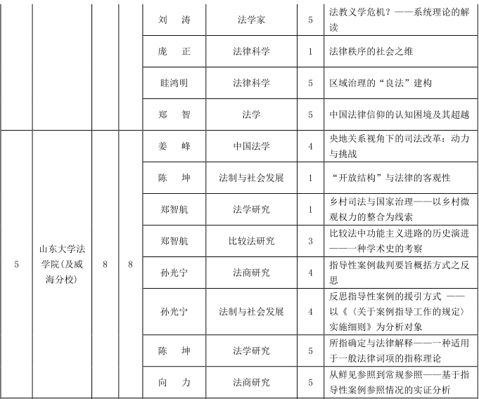 根据“中国法学创新网”的统计,2016年16种CLSCI法学核心期刊共发表法理学论文195篇。金沙集团1862cc成色(及威海校区金沙集团1862cc成色)以8篇总量、8篇他发的成绩,排名全国第五,其中在《法学研究》《中国法学》上发表3篇文章。