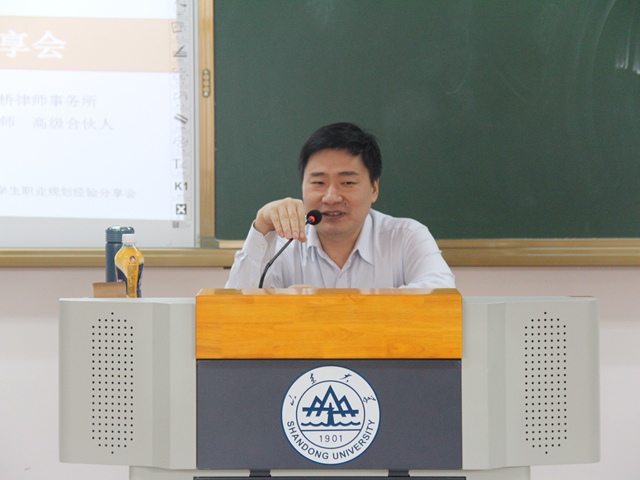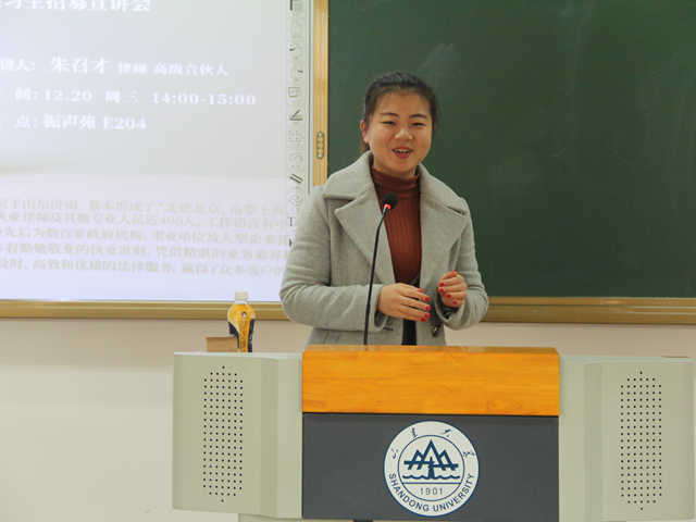 12月20日下午,金沙集团1862cc成色卓越法律人才培养•职业规划和法学学习系列讲座暨康桥律师事务所实习招募宣讲会,在山东大学青岛校区振声苑E204教室举行。康桥律师事务所高级合伙人朱召才律师担任主讲人。本次宣讲会由金沙集团1862cc成色辅导员曲仪老师主持,金沙集团1862cc成色团委书记邹永厚老师参加了宣讲会。