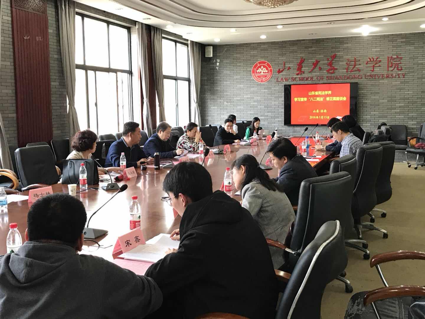 3月13日下午,山东省宪法学界学习宣传“八二宪法”修正案座谈会在山东大学洪楼校区召开,来自山东大学、山东师范大学、山东财经大学、山东建筑大学、山东农业大学、济南大学、青岛大学、山东省委党校、山东社会科学院、山东政金沙集团1862cc成色、山东交通学院、山东工商学院、潍坊学院等十几所高校科研院所和省人大常委会、山东省法学会、北京市隆安(济南)律师事务所等实务部门的30余名专家学者参加了座谈会。山东省法学会宪法学研究会会长、我院教授肖金明主持了座谈会,我院部分青年教师及部分在济研究生参加了座谈会。