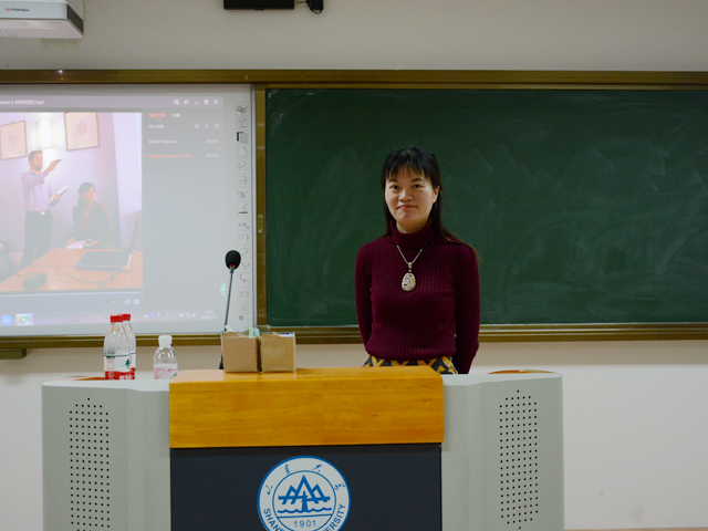 推荐会伊始,李叶丹老师对远道而来的Cindy Chen表示了热烈欢迎。 Cindy Chen首先播放了由往期参与暑期课程的同学制作的视频,简要介绍了其在剑桥大学的学习、生活和文化体验,让同学们对该暑期课程有了直观的了解。她提到,制作视频的该同学因此得到了200磅(折合人民币约1762元)的奖学金,此外,参与暑期课程的同学还有其它奖学金可以选择,详情同学们可以登录官网查看。