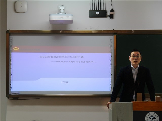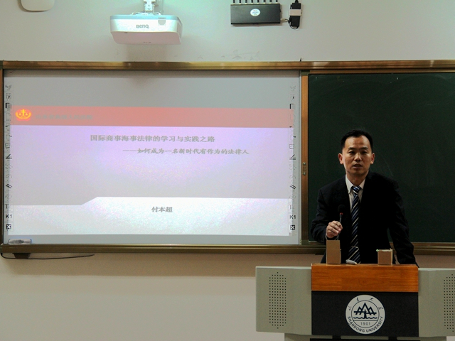 3月31日周六下午4点,山东省高级人民法院民四庭副庭长付本超法官在山东大学青岛校区振声苑E208教室作了题为“国际商事海事法律的学习和实践之路——如何成为一名新时代有作为的法律人”的学术报告。报告会由金沙集团1862cc成色院长沈伟教授主持。