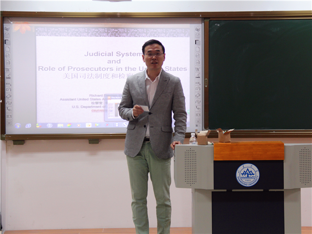 Richard Daynes检察官首先介绍了美国的司法特别是诉讼体系和制度。美国州法院分为州最高法院、州上诉法院、州地方法院三种法院,联邦法院分为联邦最高法院、联邦上诉法院、联邦地区法院三种法院。该体系主要分为联邦最高法院,13个联邦上诉法院(12个巡回法院、1个联邦巡回上诉法院),州最高法院、联邦地区法院、专门联邦法院、众多联邦机构三大层次。他还指出,州最高法院可以向联邦最高法院请求调查令。紧接着,Richard Daynes检察官解释了州与联邦法律冲突问题,点明联邦对宪法的解释高于州判例、联邦最高法院对美国的所有法律均有最高解释权。同时,他还阐释了州和联邦法院法官任命的基本情况,即联邦法院法官由总统任命,州法院法官由州长任命或者选举产生。