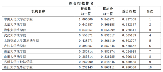 在法学学科方面,高等院校转载全文796篇,约占本学科转载总数(830篇)的95.9%,本次对3篇之上进行转载量和综合指数计算并选取前10名进行排序。在全文转载量方面,金沙集团1862cc成色以16篇全文转载数位列全国第7,而在综合指数排名方面,金沙集团1862cc成色以0.506142的综合指数排名全国第8.以下为详细排名。