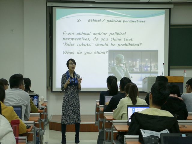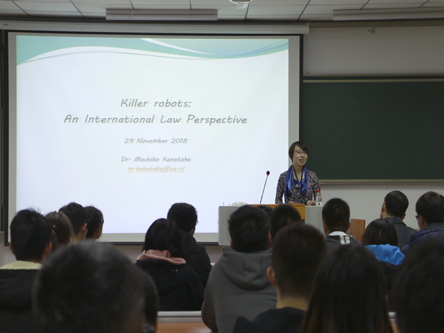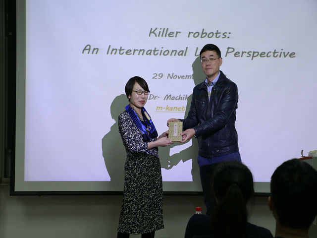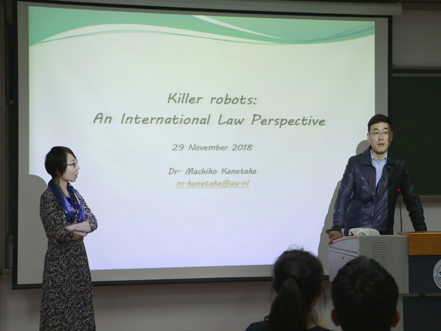 接下来, Machiko Kanetake博士分别围绕“杀人机器人的伦理和政治问题”、“传统国际法框架下合法性问题”及“新国际法框架下合法性问题”三个部分展开了此次专题讲座。