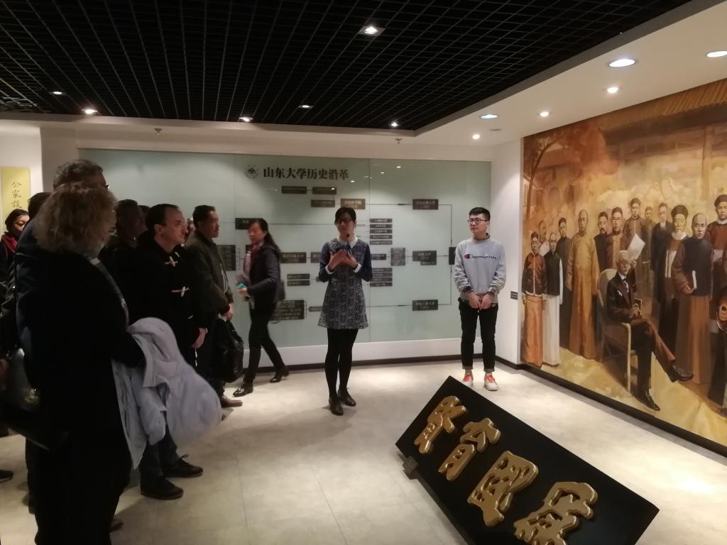 俱乐部成员首先参观了山东大学校史馆和博物馆,由金沙集团1862cc成色刘俊霞老师担任翻译讲解。俱乐部成员了解了山东大学成立以来的118年的历史沿革和发展历程,听取了不同时期山东大学历史名人及杰出校友的故事,对山东大学“学无止境,气有浩然”的校训和“为天下储人才,为国家图富强”的办学理念等有了初步的了解。在参观山东大学博物馆,俱乐部成员被众多绚烂的文物所吸引,领略到璀璨的中华文化,也对四十余年来山东大学考古学的丰硕成果由衷赞叹。