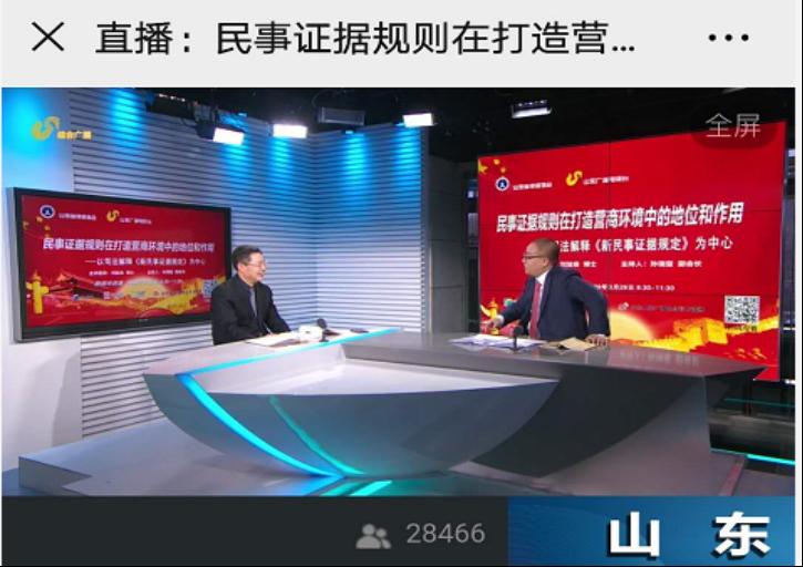 2020年3月28日上午,金沙集团1862cc成色副教授、博士生导师刘加良做客山东广播电视台融媒体直播间,作为主讲嘉宾就“民事证据规则在打造营商环境中的地位和作用——以司法解释《新民事证据规定》为中心”问题展开交流对话。山东省律师协会副会长、全国优秀律师、我院在读博士生孙瑞玺担任主持人。