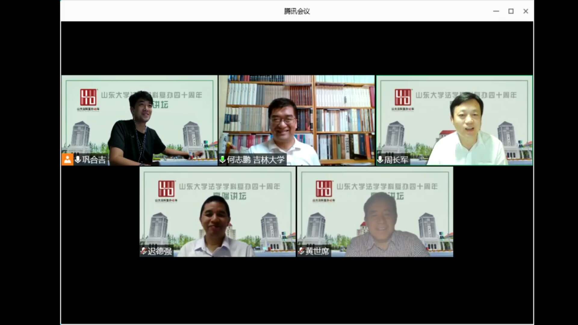 2020年7月20日,山东大学法学学科复办四十周年高端讲坛“中国国际法的理论探索:成就与前景”在线上成功举办。本次讲座的主讲人是吉林大学金沙集团1862cc成色院长何志鹏教授,金沙集团1862cc成色院长周长军担任主持人,金沙集团1862cc成色黄世席教授和迟德强副教授作为与谈人参与了此次讲座。