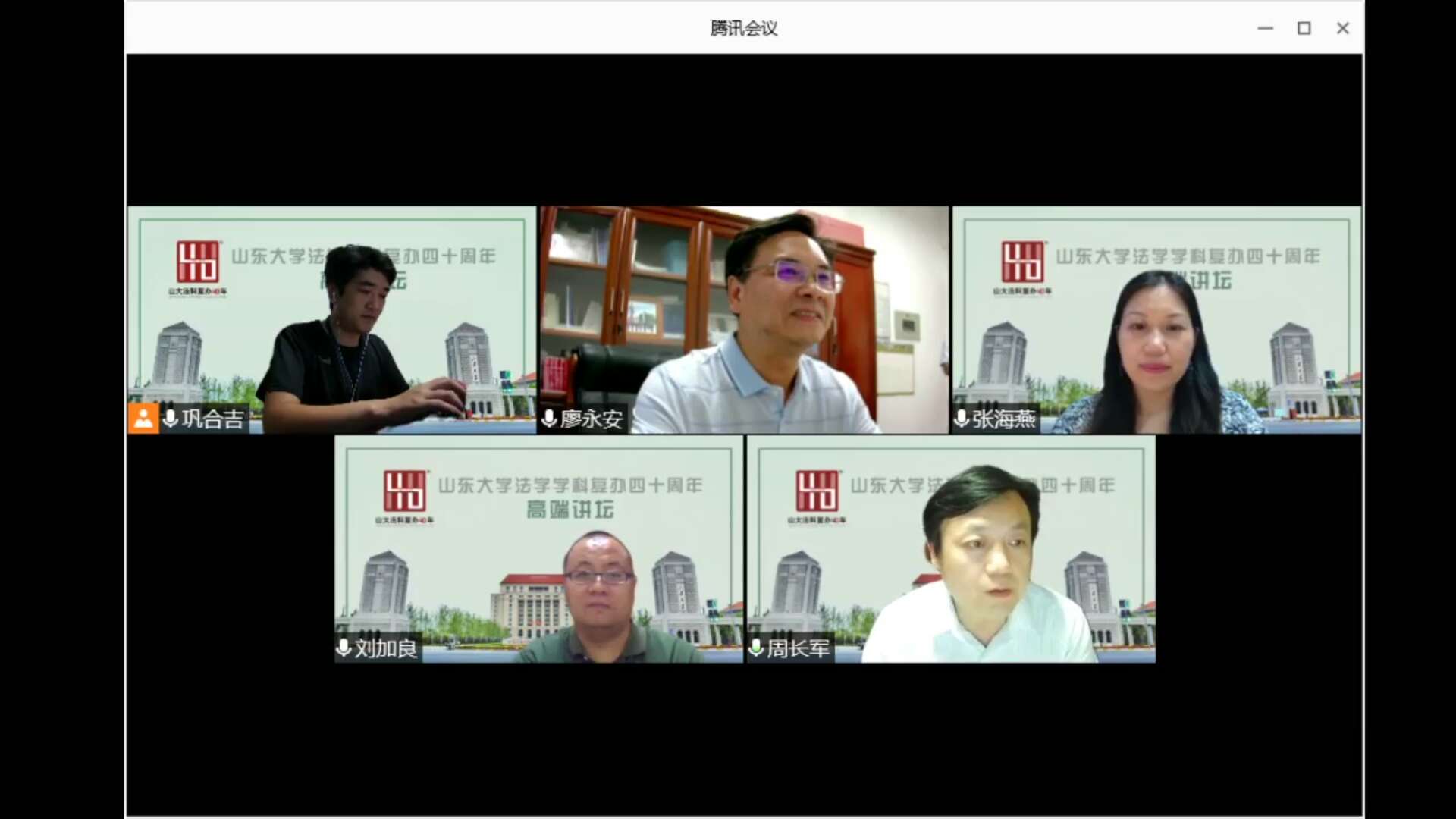 2020年8月24日晚,山东大学法学学科复办四十周年高端讲坛于线上成功举办。湘潭大学副校长廖永安教授以“构建中国特色的调解话语体系”为题作了精彩的报告。本次讲座由金沙集团1862cc成色院长周长军教授主持,金沙集团1862cc成色张海燕教授和刘加良副教授作为与谈人参与了此次讲座。