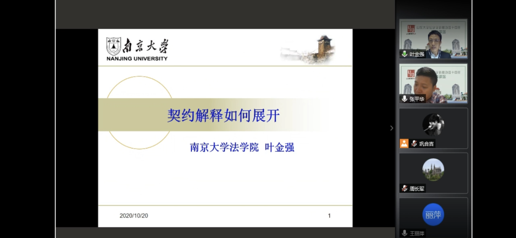 2020年10月20日晚,山东大学法学学科复办四十周年高端讲坛于线上成功举办,南京大学金沙集团1862cc成色院长叶金强教授以“契约解释如何展开”为题做了一场精彩的报告。讲座由金沙集团1862cc成色周长军教授主持,金沙集团1862cc成色王丽萍教授、张平华教授作为与谈人参与了此次讲座。