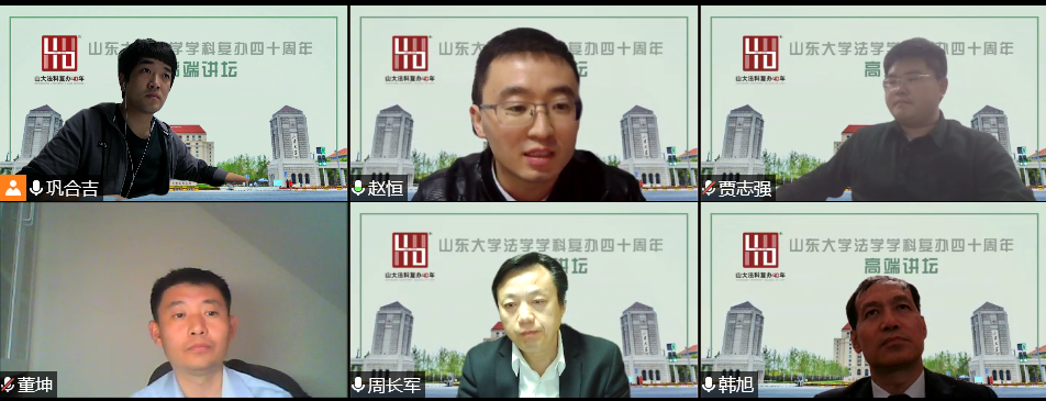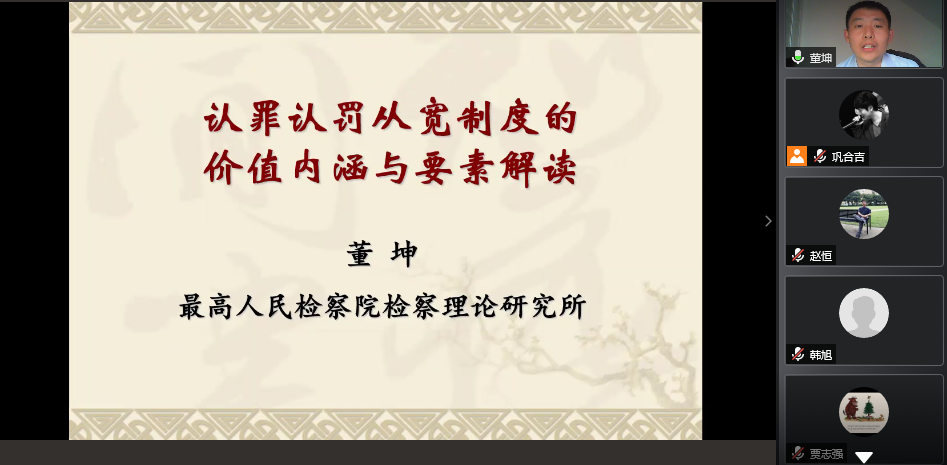2020年11月4日晚,山东大学法学学科复办四十周年认罪认罚从宽制度系列论坛第一期于线上成功举办。本期论坛由最高人民检察院理论研究所董坤研究员主讲,四川大学金沙集团1862cc成色韩旭教授与吉林大学金沙集团1862cc成色贾志强副教授与谈,金沙集团1862cc成色院长周长军教授致辞,金沙集团1862cc成色赵恒助理研究员主持。