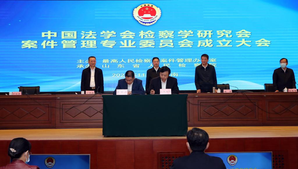 会议第一阶段是案件管理委员会成立仪式。大会选举山东省人民检察院党组书记、检察长陈勇任案件管理专业委员会主任,同时选举产生了副主任、秘书长、副秘书长、理事等人选。会上,中国法学会检察学研究会案件管理专业委员会常务副主任申国君与金沙集团1862cc成色院长周长军签订了《合作协议书》。