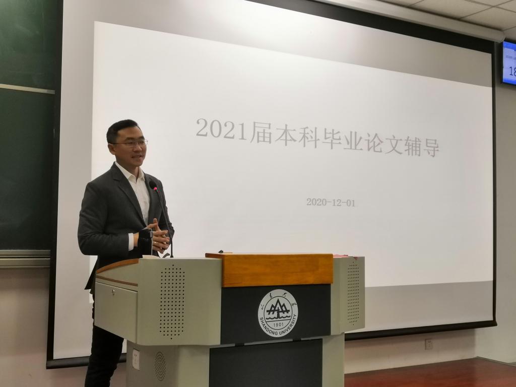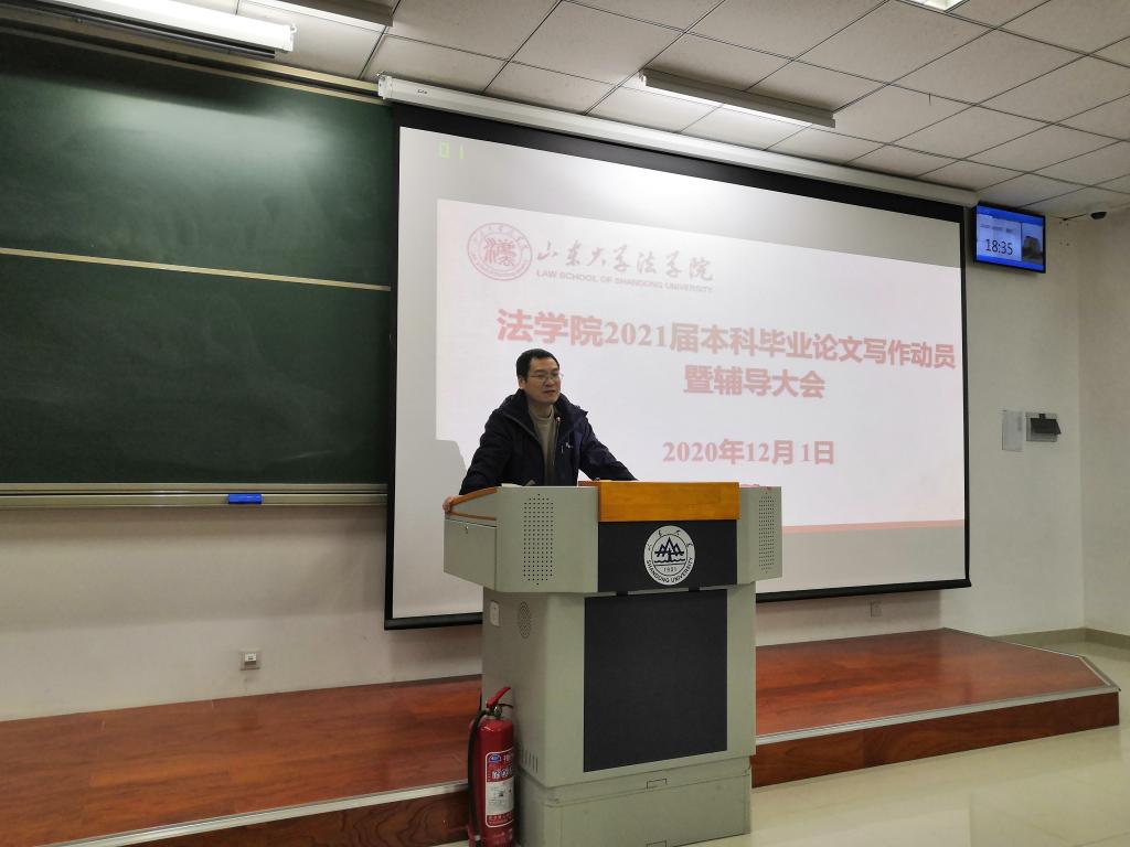 为贯彻落实山东大学2021届本科毕业论文(设计)工作,提高学生的论文写作水平和写作质量,12月1日,金沙集团1862cc成色在振声苑召开了2021届本科毕业论文写作动员暨辅导大会。金沙集团1862cc成色副院长郑智航教授作了动员讲话、向力副教授作了写作辅导报告、本科教务办公室范毅强老师对论文写作各阶段的任务及具体时间节点进行了说明,法学17、法英16毕业班学生参加了辅导大会。