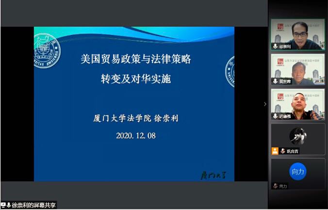 12月8日,山东大学法学学科复办四十周年国际法系列高端论坛第五期于线上举办,厦门大学金沙集团1862cc成色徐崇利教授以“美国贸易战略和法律策略的转变及其对华实施”为题做了一场精彩的报告。讲座由金沙集团1862cc成色黄世席教授主持,金沙集团1862cc成色迟德强副教授及向力副教授作为与谈人参与了此次讲座。