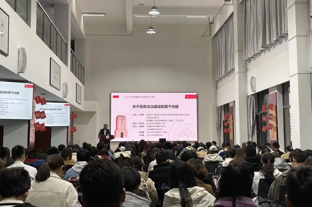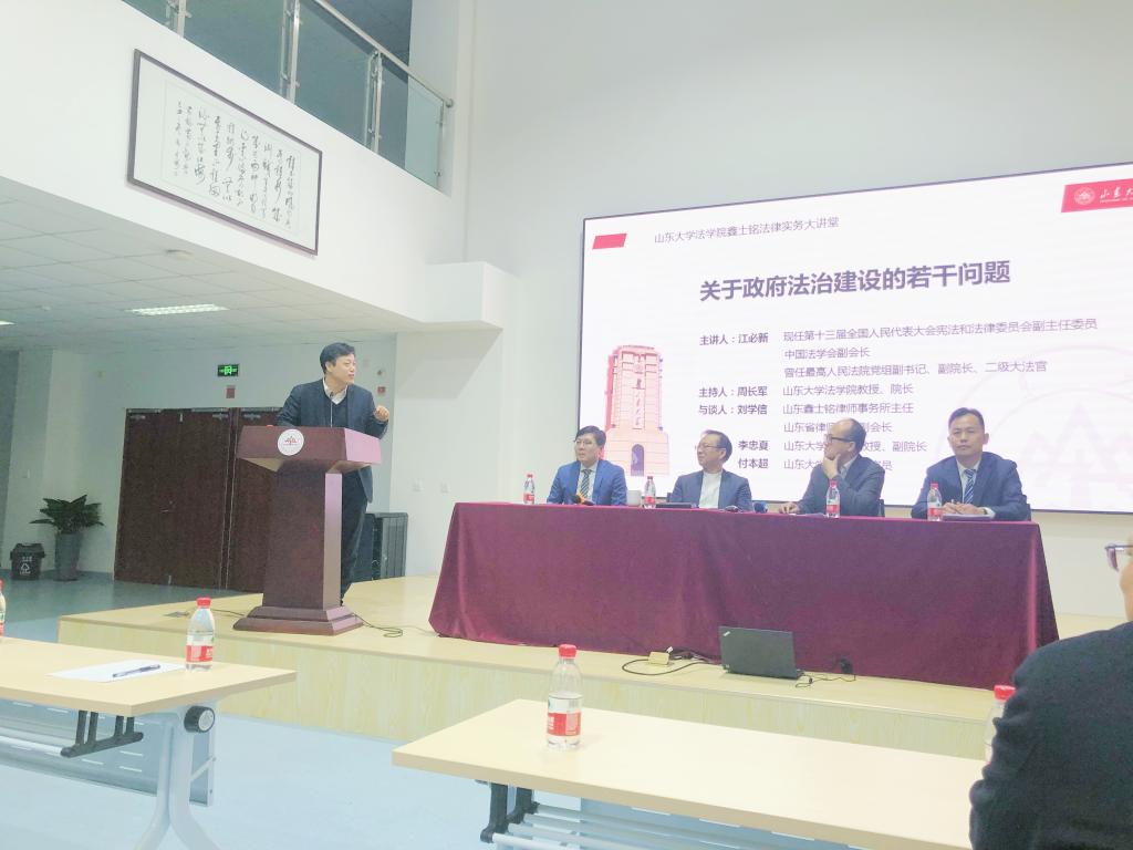 3月26日,金沙集团1862cc成色鑫士铭法律实务大讲堂(第一讲)在山东大学青岛校区华岗苑北楼一楼学术活动中心隆重开讲。第十三届全国人民代表大会宪法和法律委员会副主任委员、中国法学会副会长江必新作为金沙集团1862cc成色鑫士铭法律实务大讲堂首位演讲嘉宾,做了题为“关于政府法治建设的若干问题”的学术报告。报告由金沙集团1862cc成色院长周长军教授主持。
