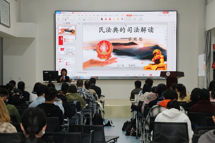 下午二时,青岛市中级人民法院民二庭副庭长宋丽华在华岗苑北楼一楼学术报告中心为同学们作了以“民法典的司法解读——学、用、思”为题的讲座。讲座由张平华教授主持,助理研究员孙犀铭作为与谈人。
