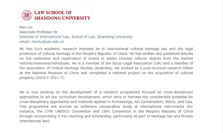 刘浩副研究员主要从事国际文化遗产的法律保护、跨国追索海外流失文物、艺术品投资的法律风险防范、跨国文物犯罪的理论与实践等学术研究,现已公开出版专著《文物大浩劫:中国对日本追索战时劫掠文物的综合研究》;《流失文物争夺战:当代跨国文物追索的实证研究》,在International Journal of Cultural Property, Art, Antiquity and Law, Antiquity等国际文化遗产法权威期刊上发表论文数篇。近年来多次深度参与中国国家文物局就海外流失文物追索的法律工作,为海外流失文物追索提供法律建议与政策咨询,屡次提交内参报告均获部级领导采纳与批示。