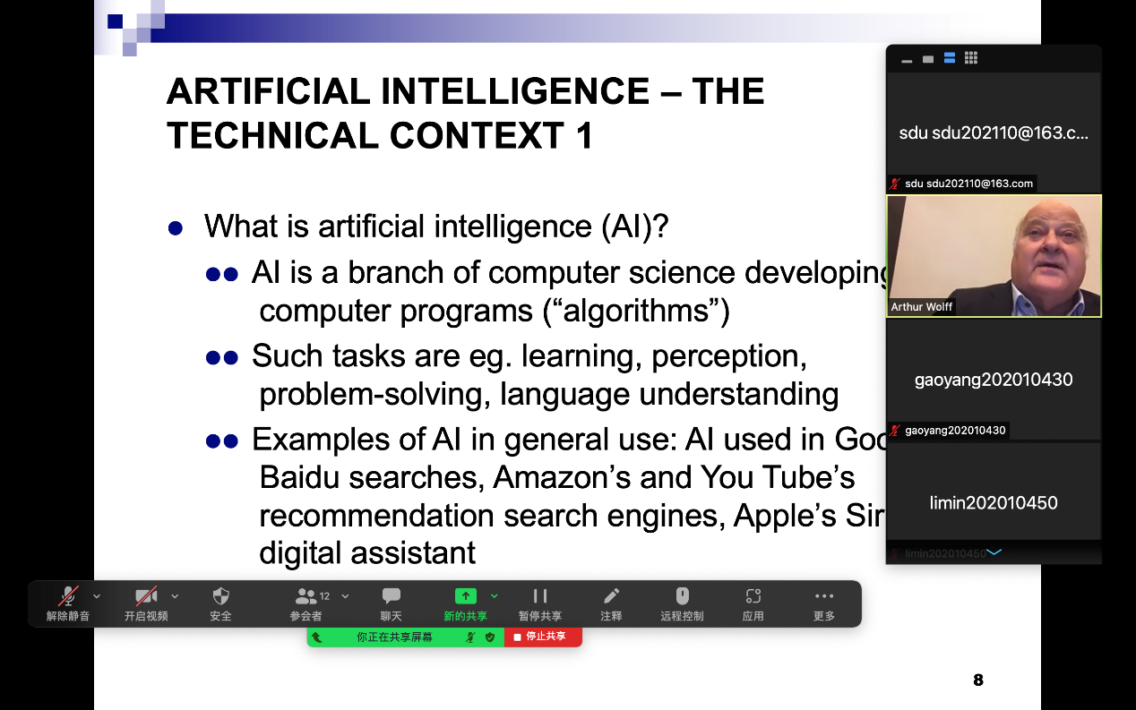 本次授课为期8天,主要介绍了人工智能法及其相关问题,由浅入深地为同学们讲述了人工智能的法律、监管方式及相关政策,在司法系统中的应用,以及在中国人工智能的有关政策与基本法律。除了课程讲述以外,Arthur Wolff教授尤其注重学生对知识的吸收理解程度,以及对于学生表达能力的培养。不仅在每堂课前为同学们留下了细致的导读文章,课后还根据学习进度为同学们布置相应的思考题。参与的学生们积极提出问题,与老师在课堂上有了极佳的互动交流。课程结束后,教授还设置了口试环节,内容包括课上讲述的学习要点及其应用和延伸,对同学们的学习成果进行了考核,也鼓励了同学们能够学以致用,进一步提高对知识的应用能力。