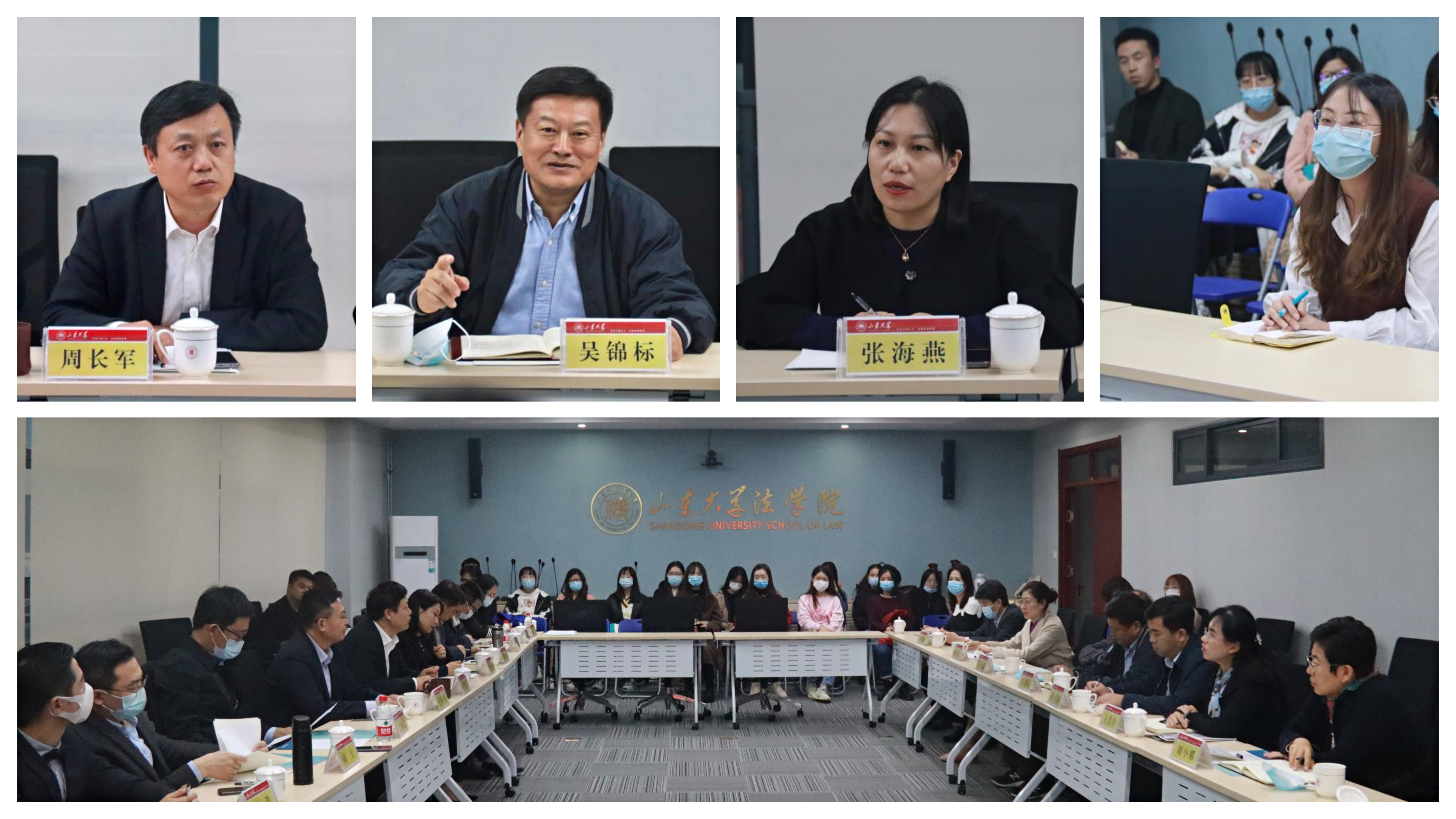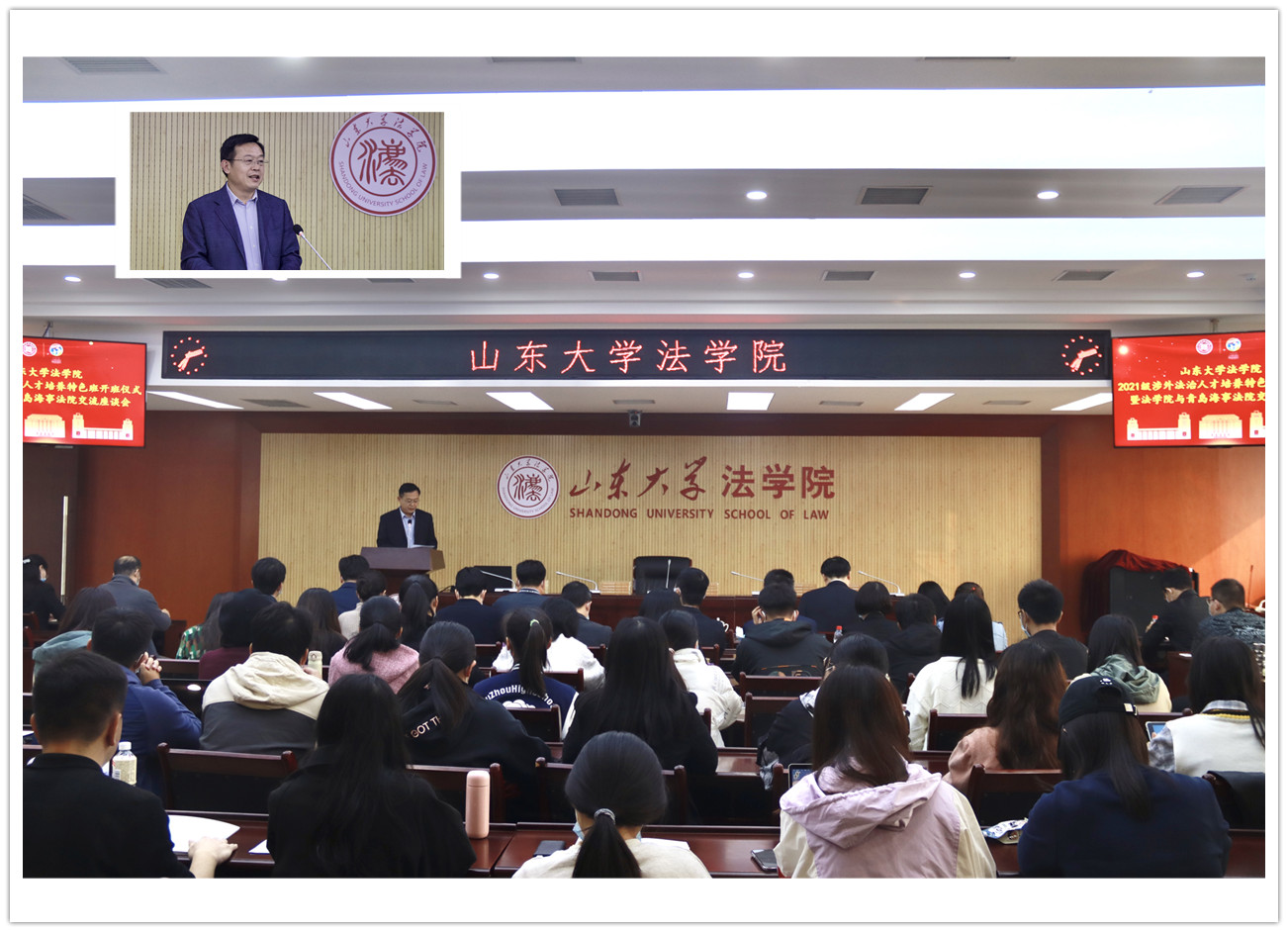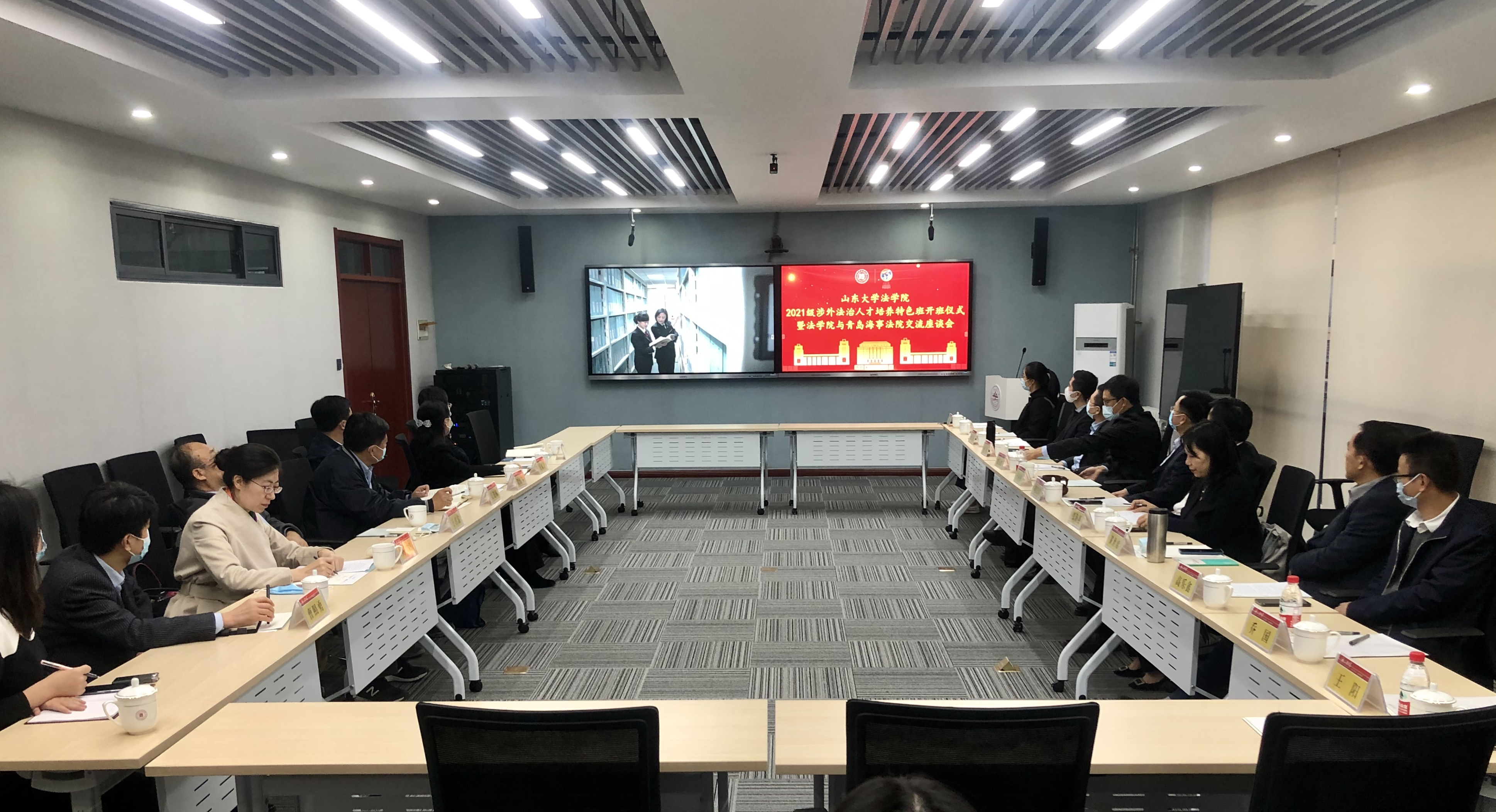 10月30日,金沙集团1862cc成色2021级涉外法治人才培养特色班开班仪式暨金沙集团1862cc成色与青岛海事法院交流座谈会在华岗苑北楼举办。青岛海事法院院长吴锦标、政治部主任段恒宋、海事审判庭庭长于喜富、审判监督庭庭长王爱玲、海商审判庭副庭长刘小娜、政治部副主任杨丹、办公室副主任曹照勇,金沙集团1862cc成色党委书记于向明、金沙集团1862cc成色院长周长军、副院长张海燕、党委副书记邹永厚、国际法研究所所长黄世席教授、向力副教授、刘浩副研究员、高乐鑫助理研究员,以及学院研究生办公室、研究生工作办公室相关老师,2021级涉外法治人才特色班新生和目前正在青岛海事法院担任法官助理的2020级法律硕士同学参加了本次活动。
