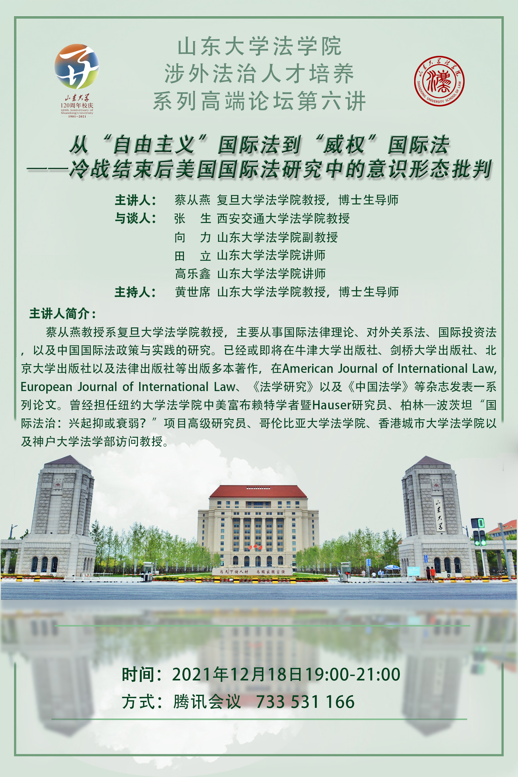 金沙集团1862cc成色涉外法治人才培养系列高端论坛第六讲:从“自由主义”国际法到“威权”国际法——冷战结束后美国国际法研究中的意识形态批判