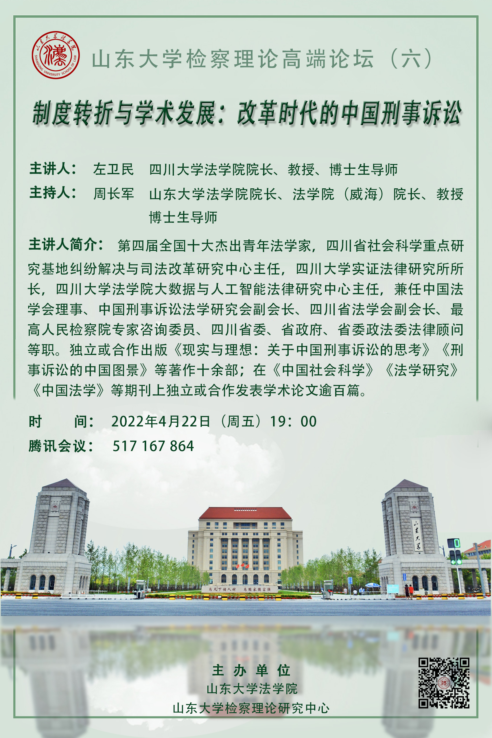 讲座预告 | 山东大学检察理论高端论坛(六):制度转折与学术发展:改革时代的中国刑事诉讼