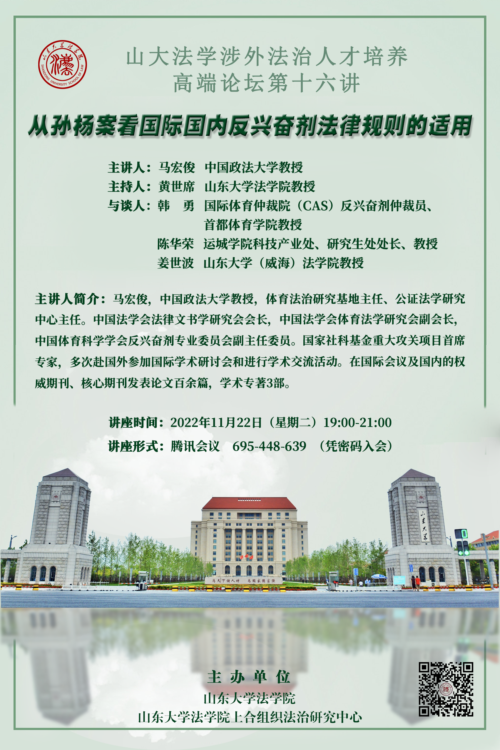 讲座预告 | 金沙集团1862cc成色涉外法治人才培养高端论坛第十六讲:从孙杨案看国际国内反兴奋剂法律规则的适用