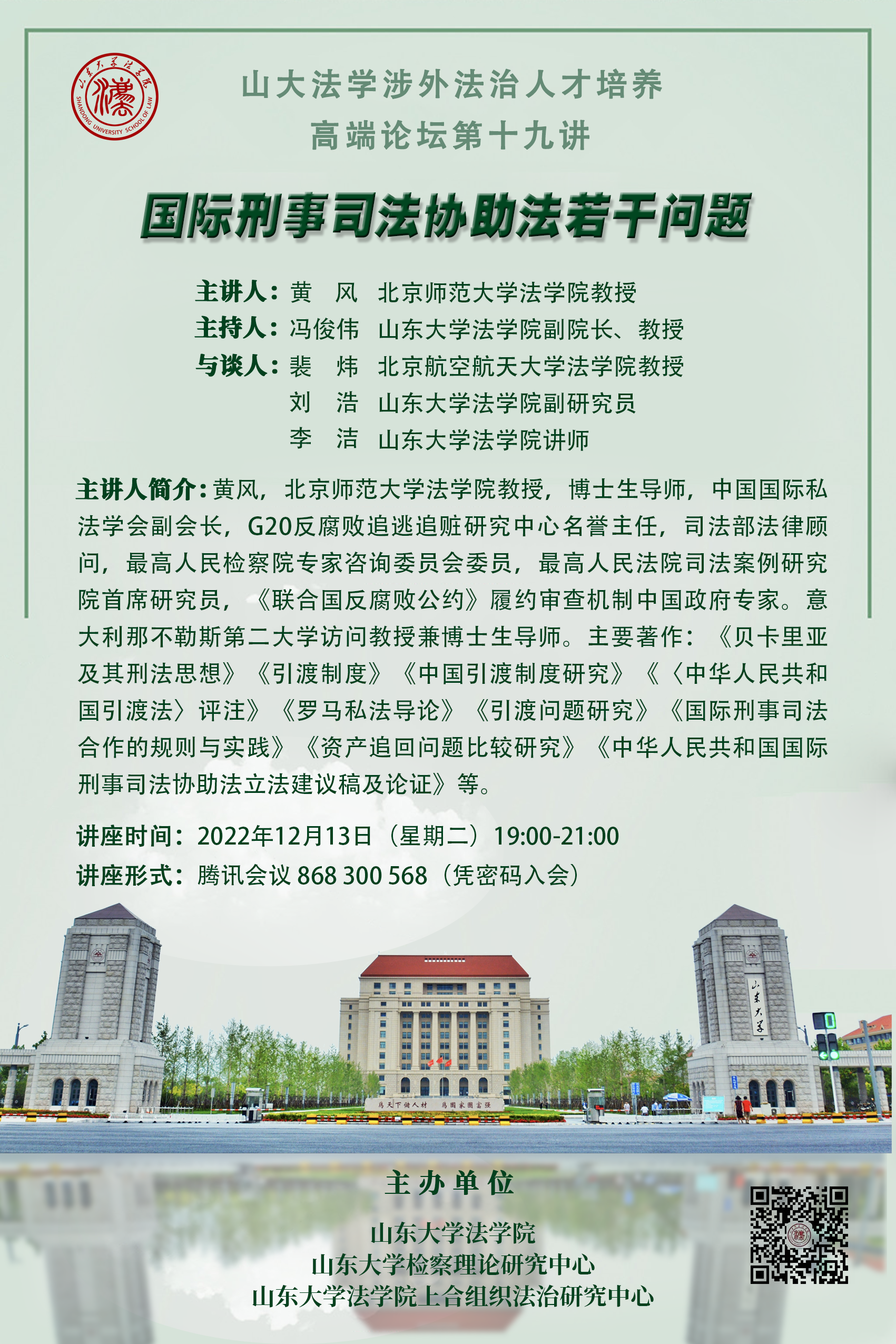 讲座预告 | 山大法学涉外法治人才培养高端论坛第十九讲:国际刑事司法协助法若干问题