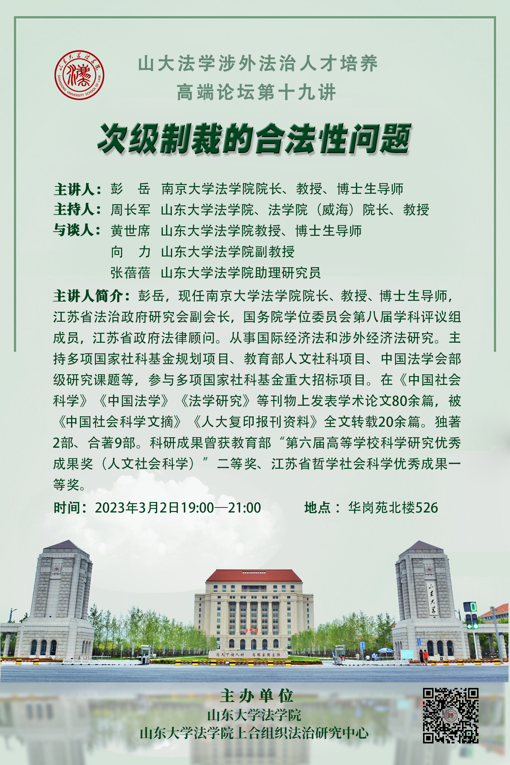 讲座预告 | 山东大学涉外法治人才培养高端论坛第十九讲:次级制裁的合法性问题