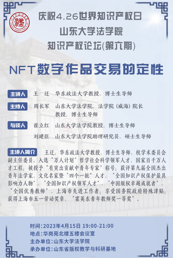 讲座预告 | 金沙集团1862cc成色知识产权论坛(第六期):NFT数字作品交易的定性