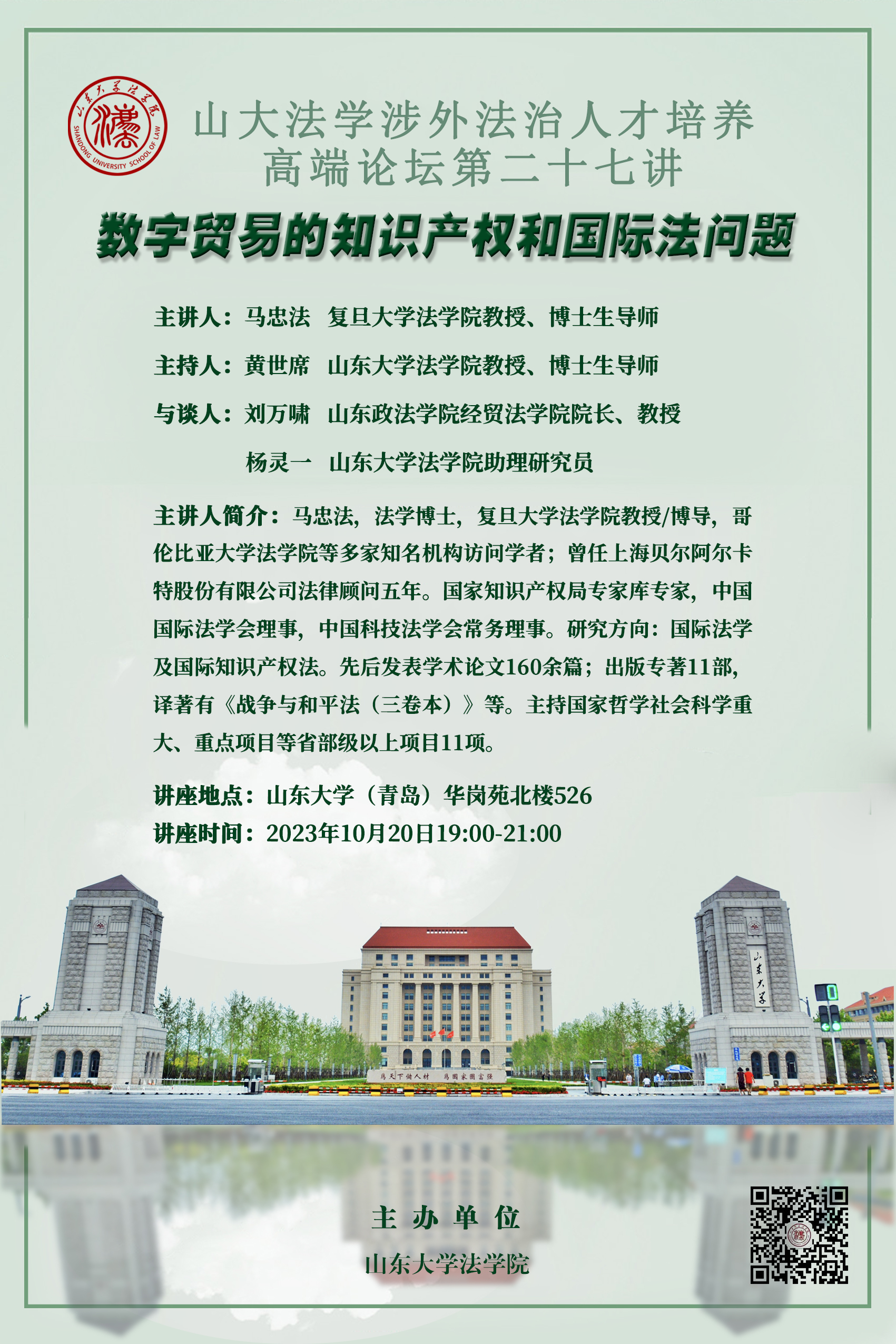 讲座预告 | 山大法学涉外法治人才培养高端论坛第二十七讲:数字贸易的知识产权和国际法问题