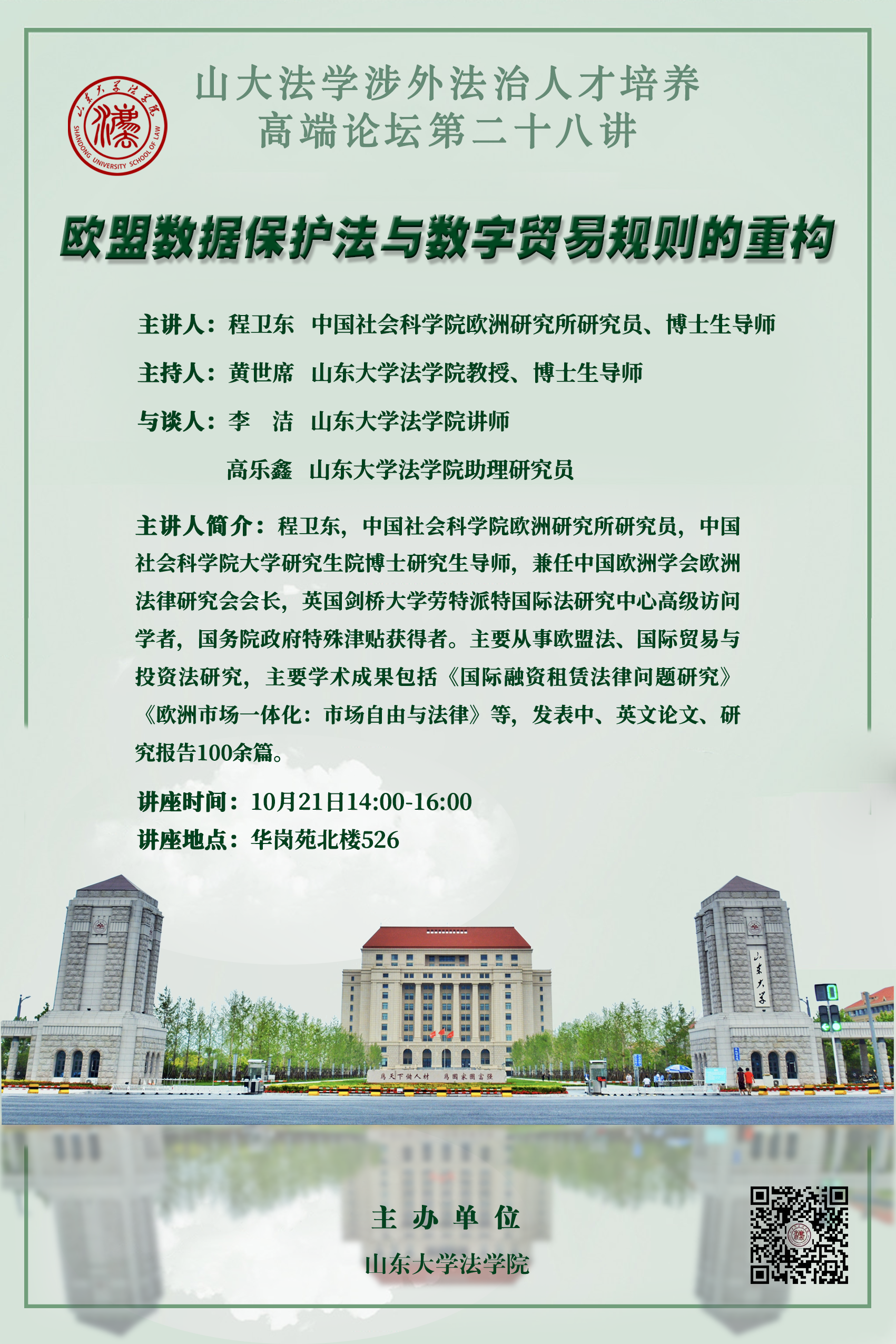 讲座预告 | 山大法学涉外法治人才培养高端论坛第二十八讲:欧盟数据保护法与数字贸易规则的重构