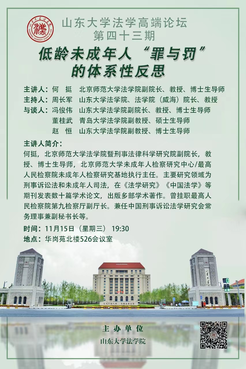 讲座预告 | 山东大学法学高端论坛第四十三期:低龄未成年人“罪与罚”的体系性反思
