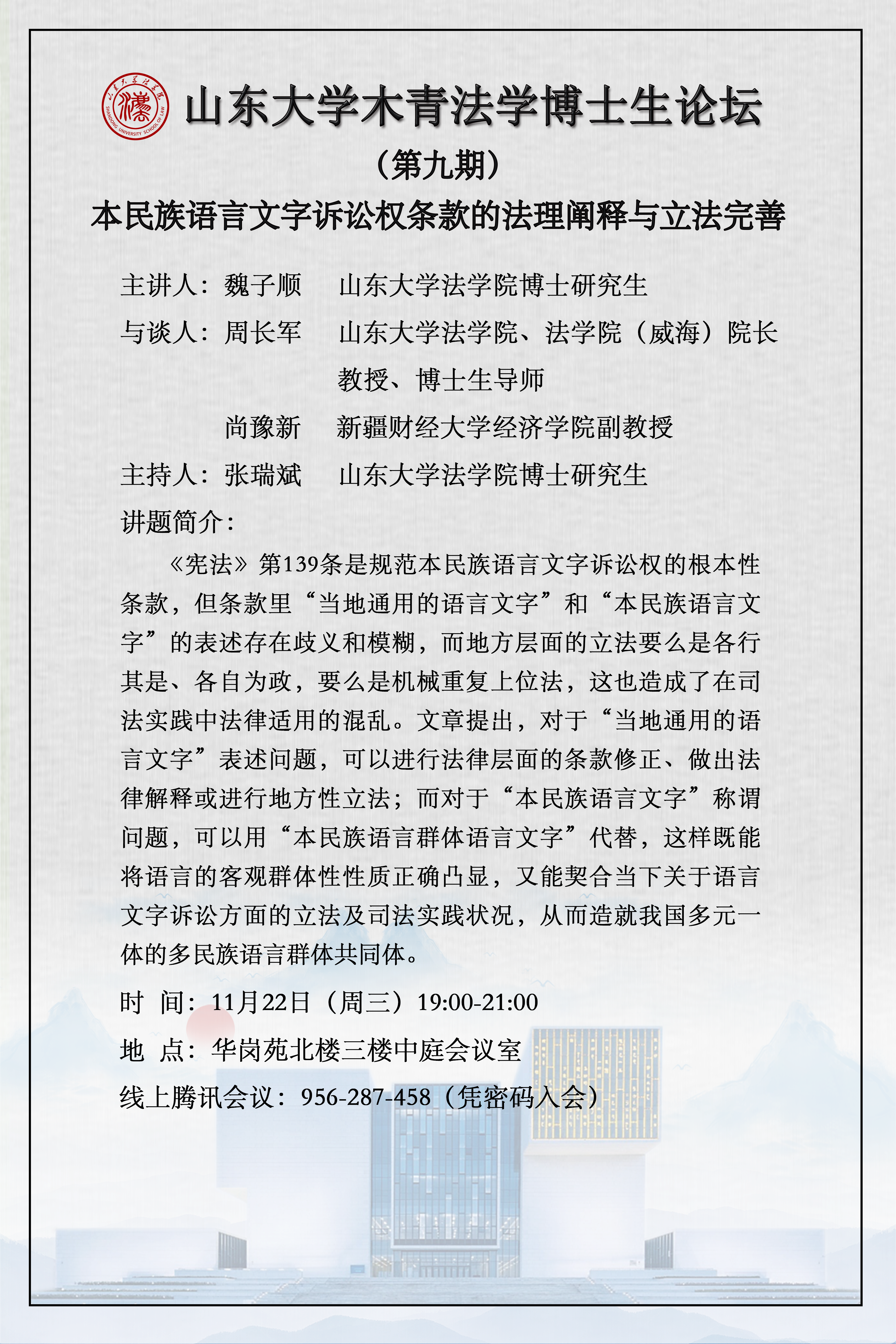 讲座预告 | 山东大学木青法学博士生论坛(第九期):本民族语言文字诉讼权条款的法理阐释与立法完善