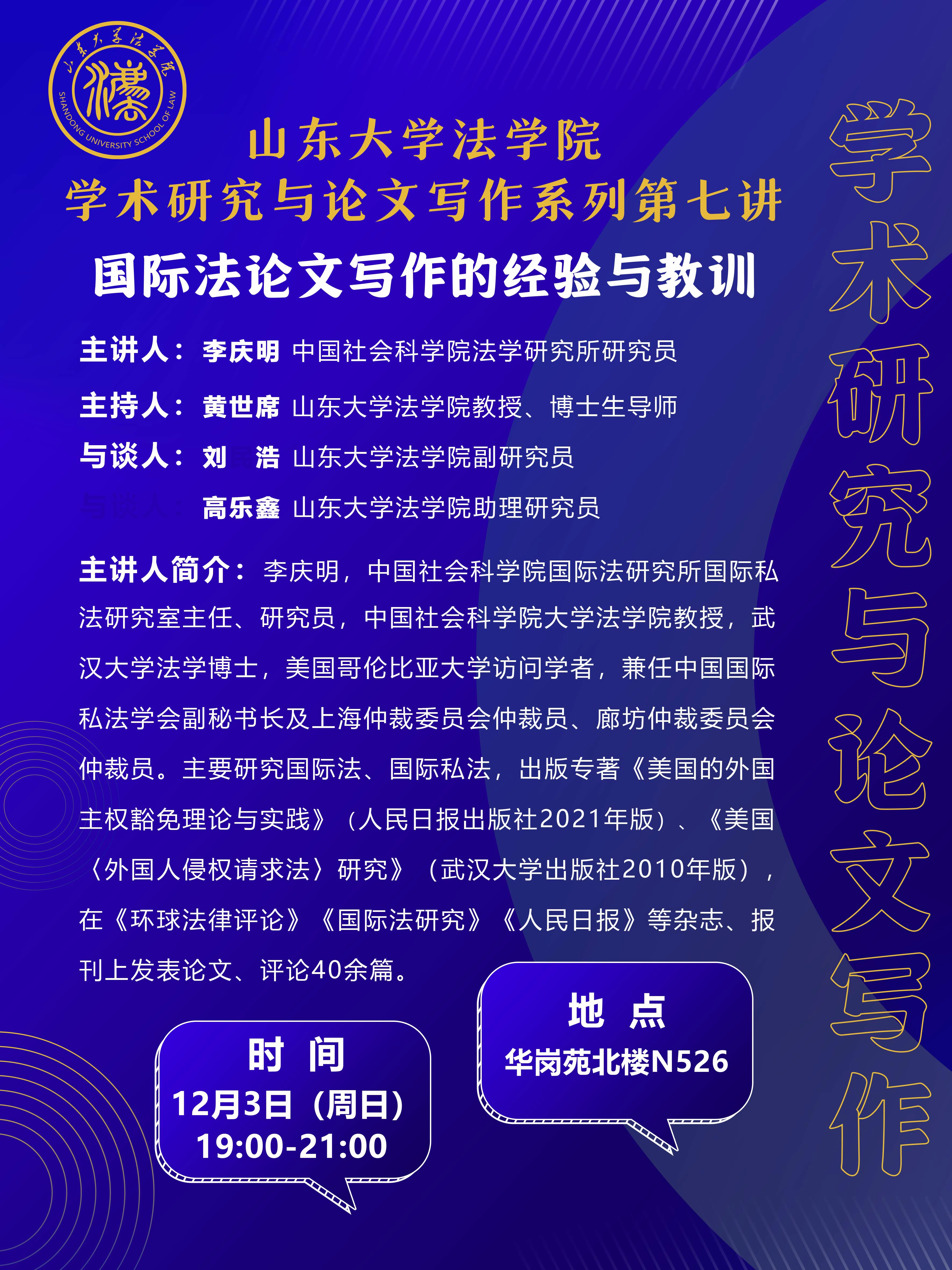 讲座预告 | 金沙集团1862cc成色学术研究与论文写作系列第七讲:国际法论文写作的经验与教训