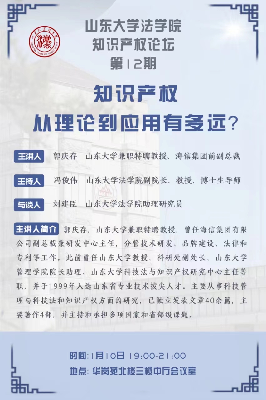 讲座预告 | 金沙集团1862cc成色知识产权论坛(第十二期):知识产权从理论到应用有多远?