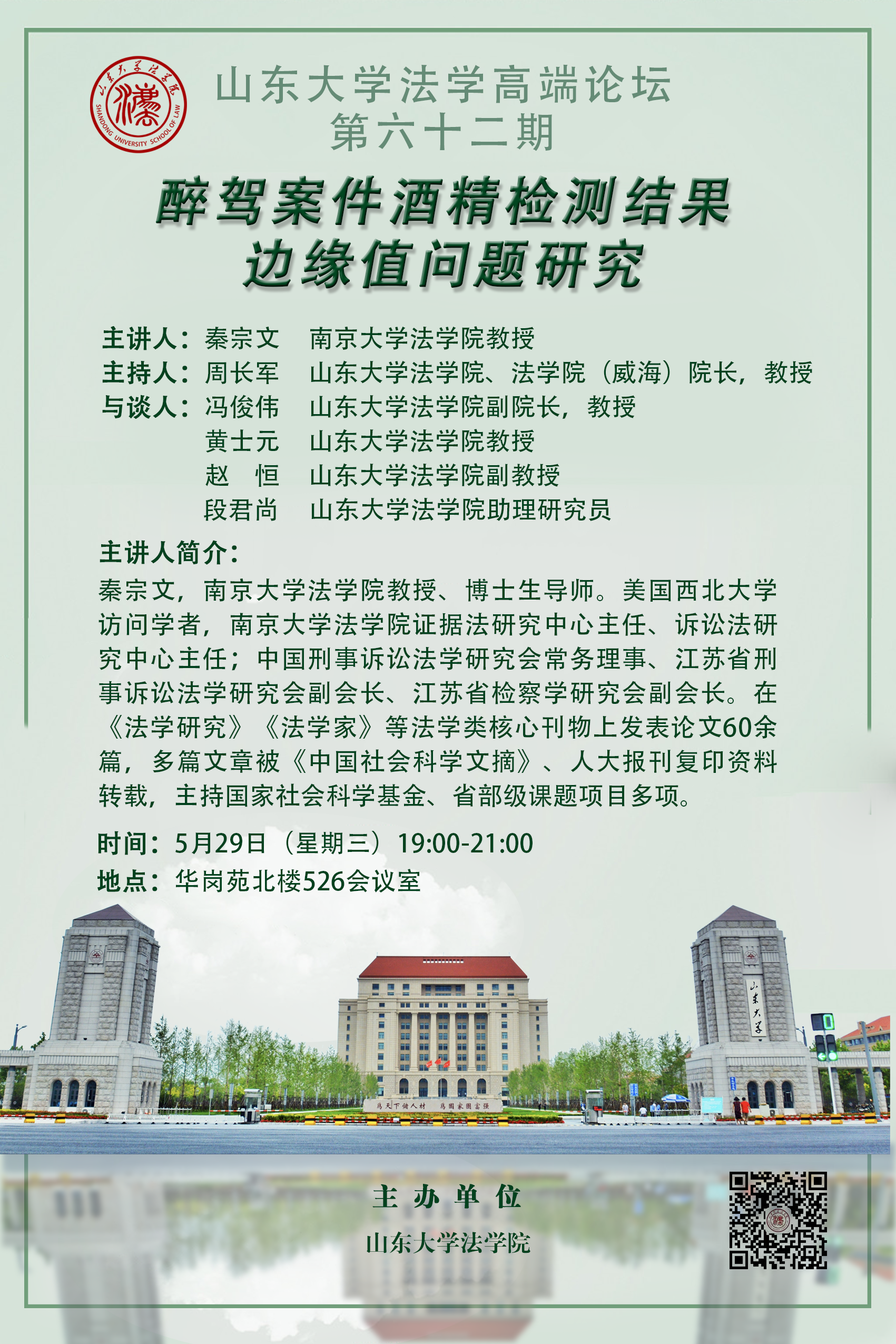 讲座预告 | 山东大学法学高端论坛第六十二期:醉驾案件酒精检测结果边缘值问题研究
