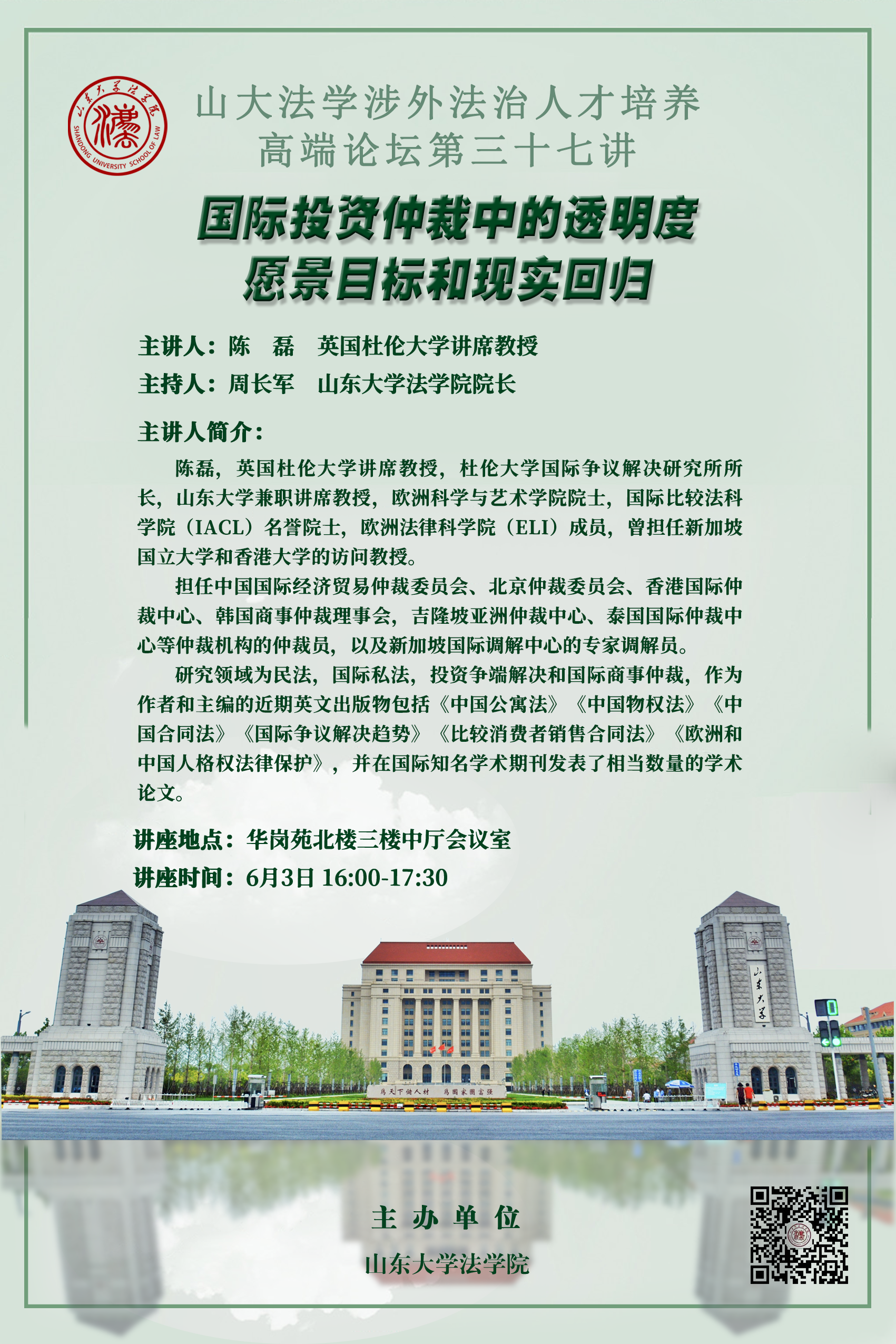 讲座预告 | 山大法学涉外法治人才培养高端论坛第三十七讲:国际投资仲裁中的透明度愿景目标和现实回归