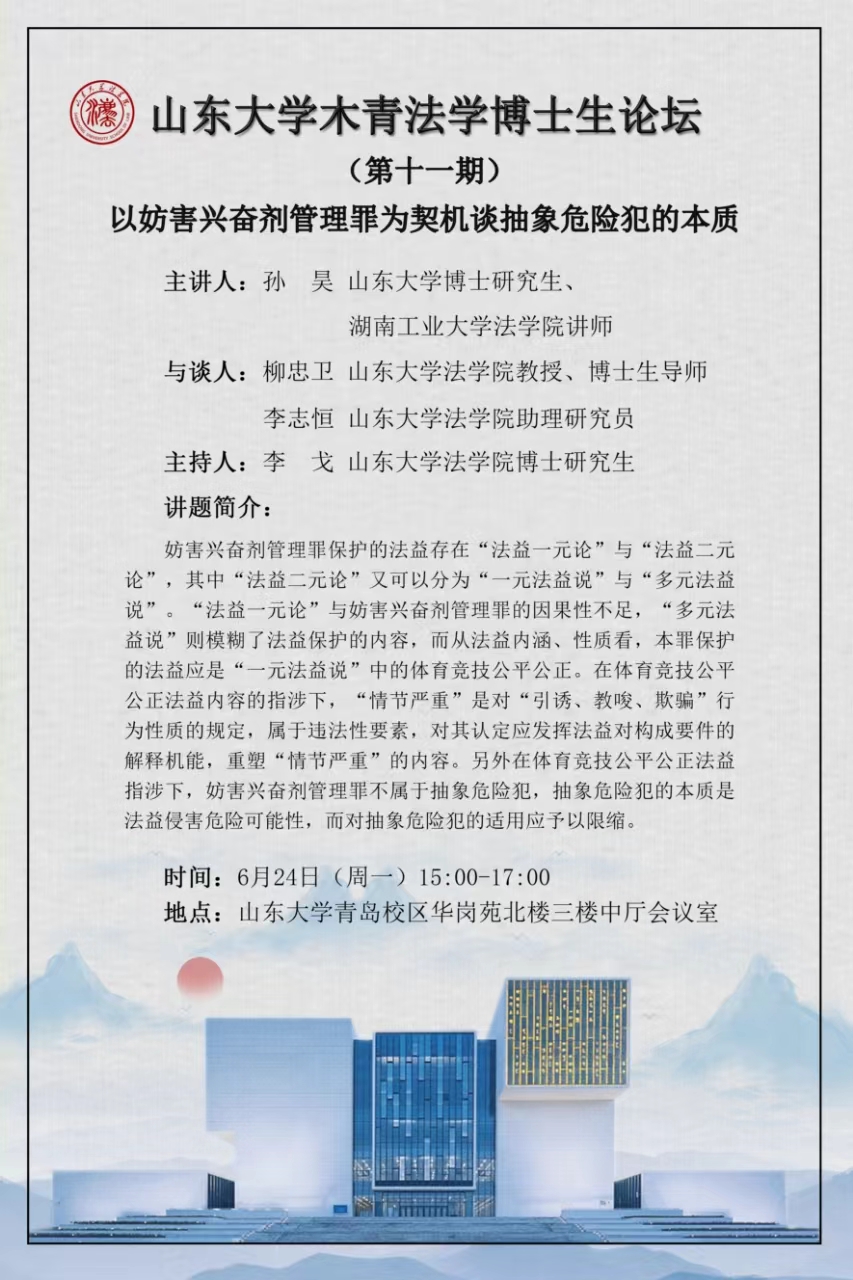 讲座预告 | 山东大学木青法学博士生论坛(第十一期):以妨害兴奋剂管理罪为契机谈抽象危险犯的本质